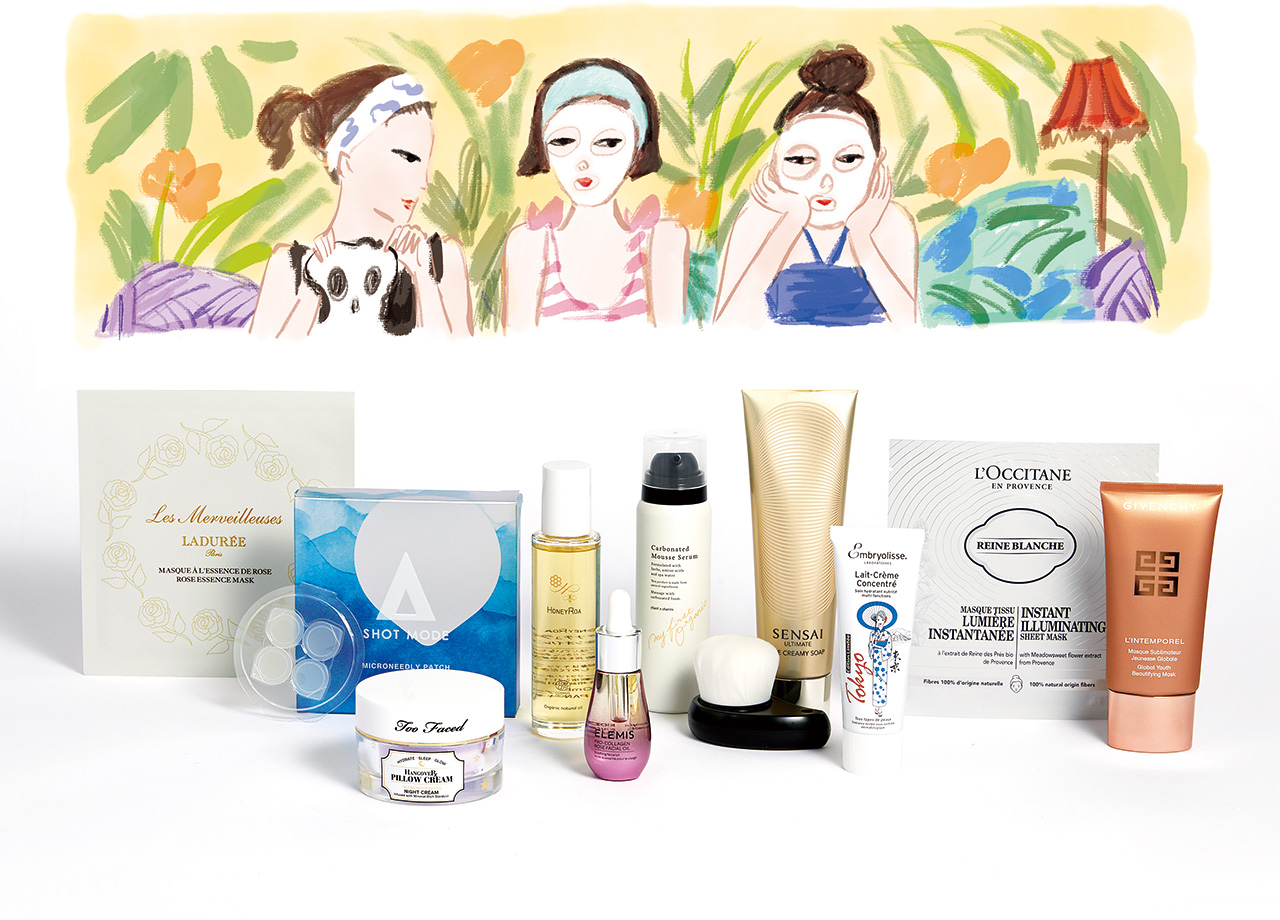 (左)シミ、そばかす、色むら、くすみの原因となるメラニンにアプローチするオーガニック レーヌデプレとホワイトマルベリーエキスを高濃度に配合。太陽と戯れた旅先での日焼けケアに。レーヌブランシュ イルミネイティングシートマスク[4枚入り、ミニローション付き]¥5,000(限定発売中)/L’occitane(ロクシタンジャポン 0570-66-6940)