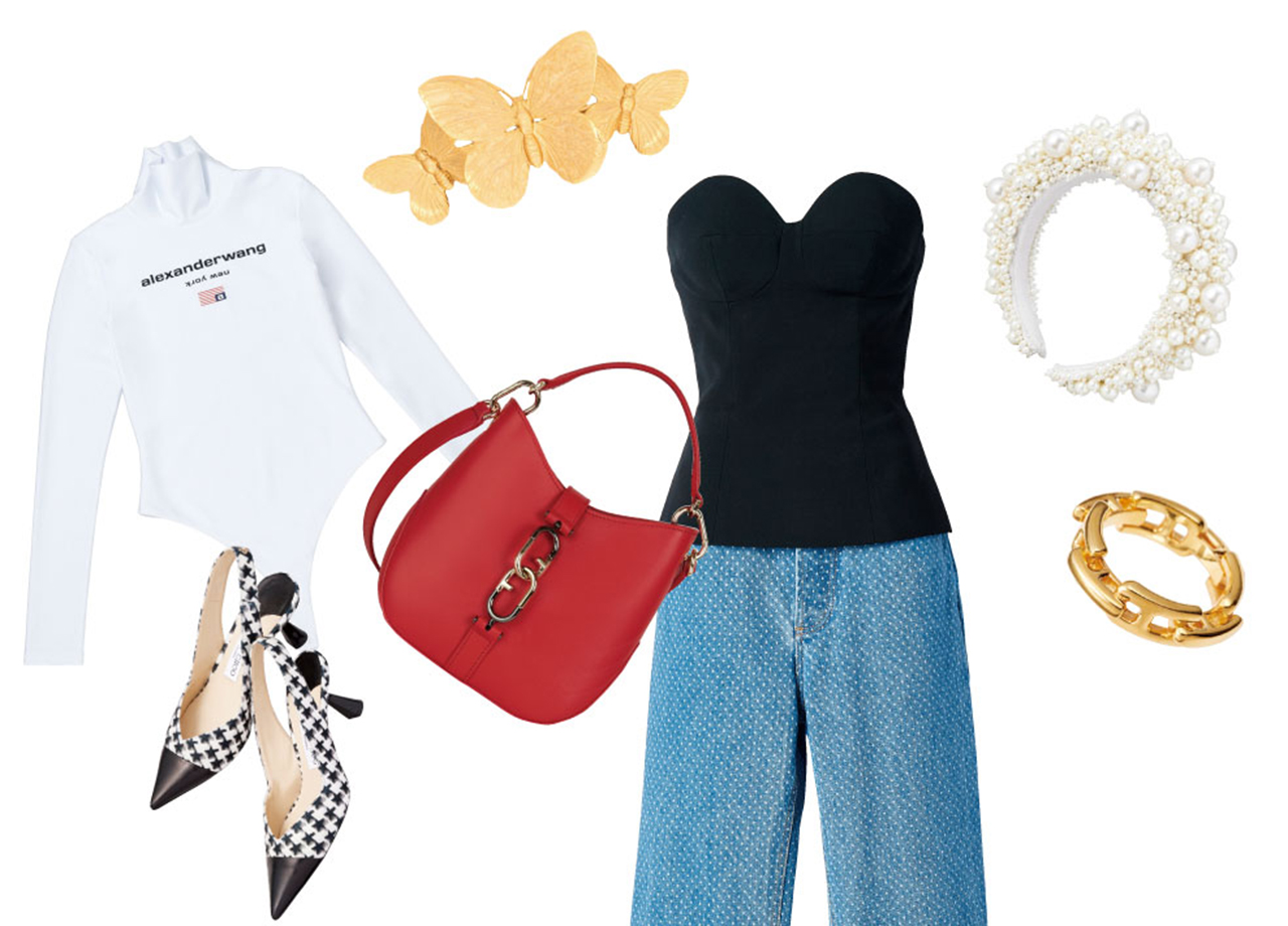 1.バレッタ ¥29,400(参考価格、輸入関税込み)/Jennifer Behr(ファーフェッチ カスタマーサービス 050-3205-0749) 2.パールカチューシャ ¥60,500/Co | Te(イザ 0120-135-015) 3.リング ¥26,400/Ambush®(アンブッシュ® ワークショップ 03-6451-1410) 4.ビスチェ ¥53,900(参考価格)/Kimhekim(エンメ 03-6419-7712) 5.ボディ ¥42,900/Alexanderwang(アレキサンダーワン 03-6418-5174) 6.パンツ ¥64,900/Paco Rabanne(エドストローム オフィス 03-6427-5901) 7.バッグ(W20.5×H19.5×D6.5cm)¥52,800/Furla(フルラ ジャパン 0120-951-673) 8.シューズ(ヒール6.5cm) ¥103,400/Jimmy Choo(ジミー チュウ 0120-013-700)