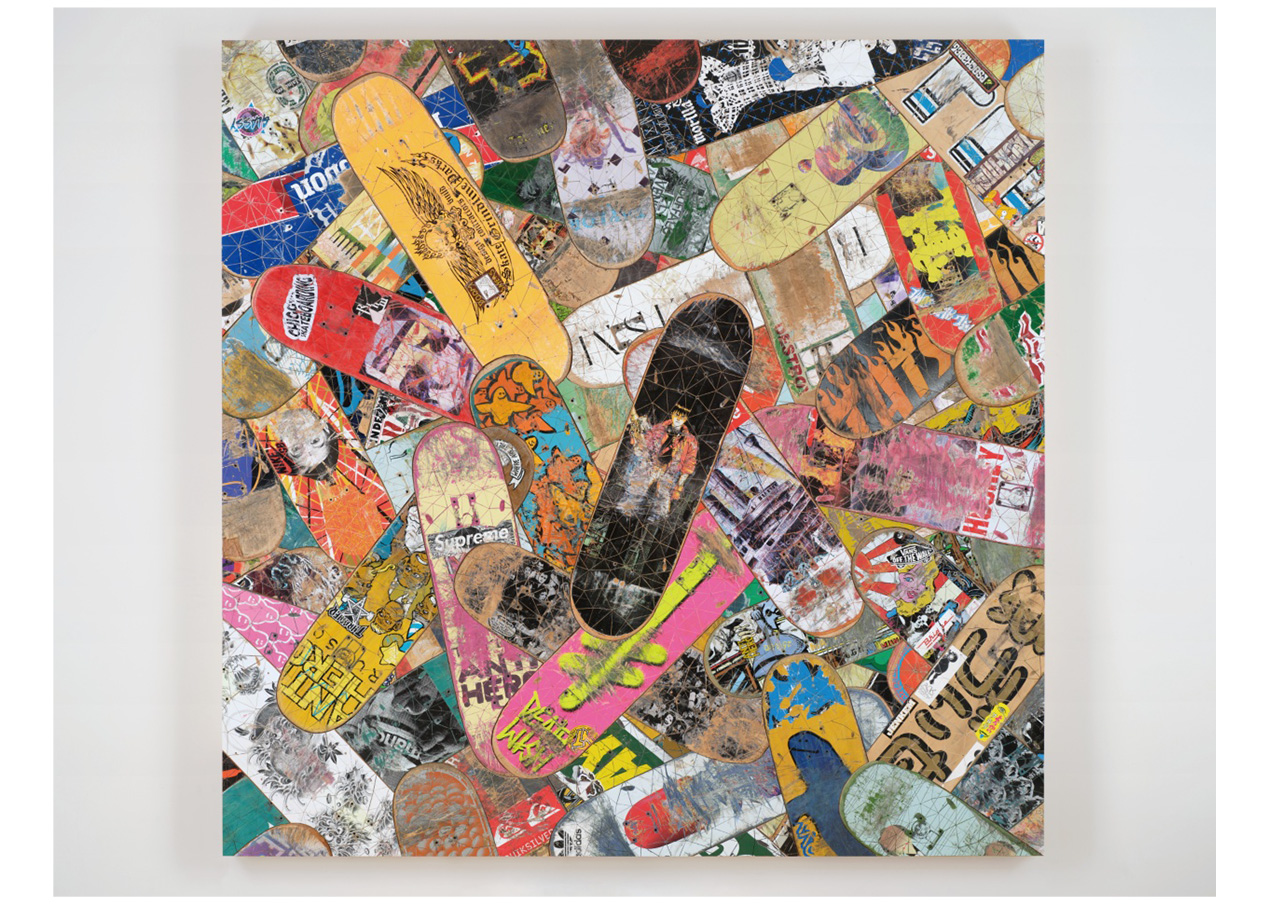 「人類の歴史を新たな視点から考察した本『サピエンス全史』に、人間は農業によって作物を支配していると思い込んでいるものの、逆に種の繁殖のために利用されているのではないかという話が出てきます。それをスケボーに置き換えるなら、僕は折れて捨てられるデッキを復活させるために、スケボーたちに利用されているのかもしれない。ネコを飼っている人が、逆にネコに飼育されているという話にも近い感覚ですね。さらに、スケボーは滑るほどにボロボロになって役割を終えますが、その姿こそが格好いい。傷をそのまま平面に落とし込みたいと試行錯誤して完成したのが『Mosh Pit』というシリーズです。スケボーの傷や折れた姿まで格好いいと思えるのは、そこに愛があるから。長年スケボーに向き合ってきたからこそ行き着いた、一つの愛の形だと思っています」