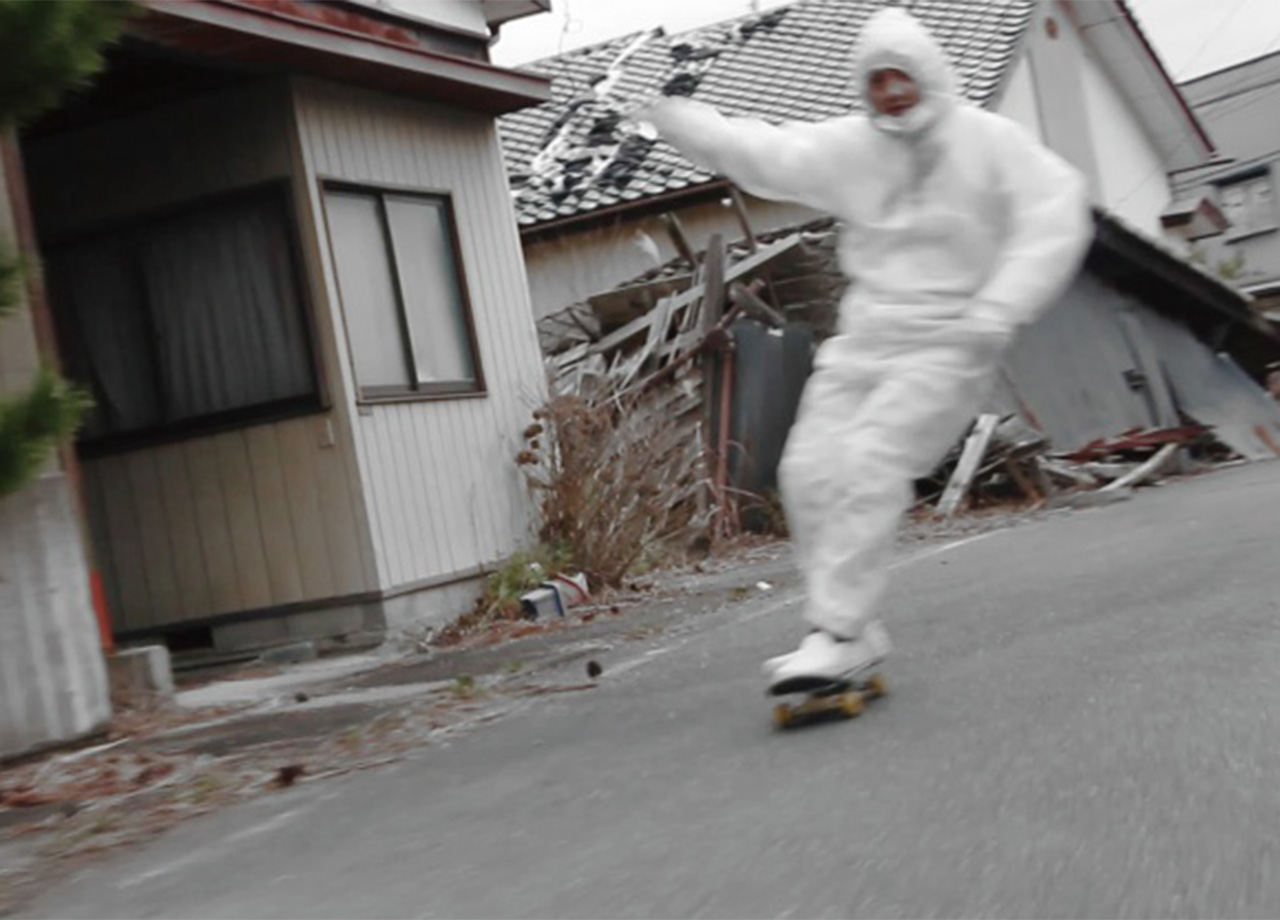 人の気配が失われ、建物が崩れた街を疾走する、防護服姿のスケーターの姿──。福島第一原子力発電所のすぐ近く、帰還困難区域で撮影された映像作品だ。BABUはスケボー、グラフィティ、絵画、立体、タトゥーなど、縦横無尽な活動を繰り広げてきた伝説的存在。スケボーに乗り街中に白いラインを描く映像作品『ANACONDA』(2006年)を皮切りに、時代と鋭く感応した表現を展開してきた。汚染された市街を猛然と駆け抜ける姿が喚起するもの。ストリートで培われた反骨の軌跡から、ほろ苦い余韻が立ち薫る。