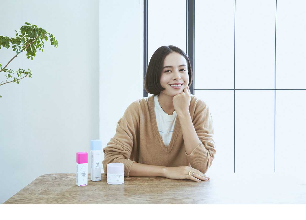 「ドランク エレファントとの出会いは上陸前。海外でもすでにめちゃくちゃ人気で、世界各地のセフォラなどでよく購入していました。私のYouTubeのチャンネルではマイベスコスとして紹介したことも! 乾燥や毛穴、ハリ不足など、細かく肌に寄り添うことで、きっちりお手入れの結果を出してくれる、そんなところに信頼を寄せています。実は、“手のひらスムージー”を実践するのは、今回が初めて。通常、クリームとローション、セラムはそれぞれテクスチャーや伸びが違うので、なかなか混ざらないものだけど、ドランク エレファントのアイテムたちは分子構造が同じなので、しっかり混ざって肌にスルッ。一瞬で肌になじみます。摩擦はお手入れの敵なので、1回で済むというのは嬉しいメリットだと思いますね。時短にもなりますし。今回、日焼け後ということもあり、かなり肌が乾燥した状態だったのですが、使用後のモイスチャーな実感はかなりのもの。調子もグングン上がっていきました。モデルという仕事は、濃いメイクを1日になんどもオフしたり、スタイリング剤が肌に触れたりと、肌にとってなかなかにタフな環境なのですが、この安定感ある保湿力があれば、乗り切れるような気がします。ドランク エレファントが掲げてる、6つの原料フリーも嬉しい。私自身、普段からなるべく避けたい成分なので、そういった面でも信頼が置けますね」