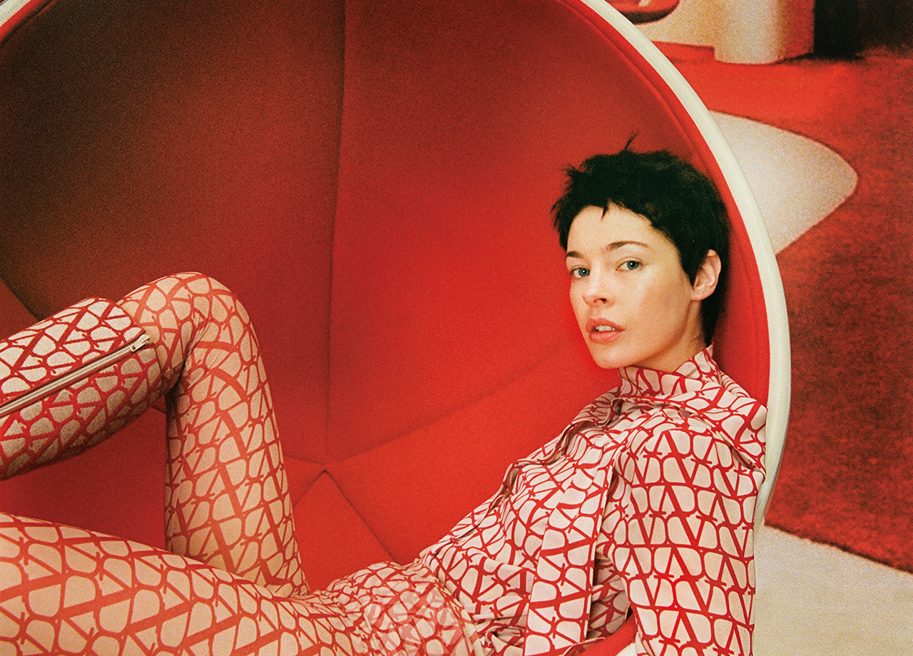ヴァレンティノの新しいロゴパターン「トワル イコノグラフ」。異星人がボディスーツを纏うように、ボウタイブラウス、タイツ、ブーツで全身をロゴで埋めつくして、ブランドのレガシーを主張して。