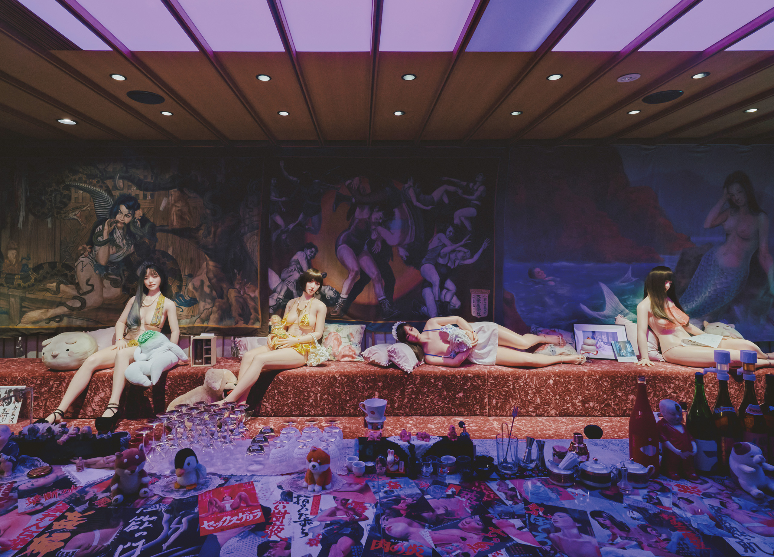 「茶と酒 わかめ」でお酒の相手をしてくれるオリエント工業のラブドールたち。人間のような精巧なラブドールだが、足にわずかに残されたバリ(つなぎ目)には切ない物語が。スタッフに尋ねてみて。壁には見世物小屋の絵看板。