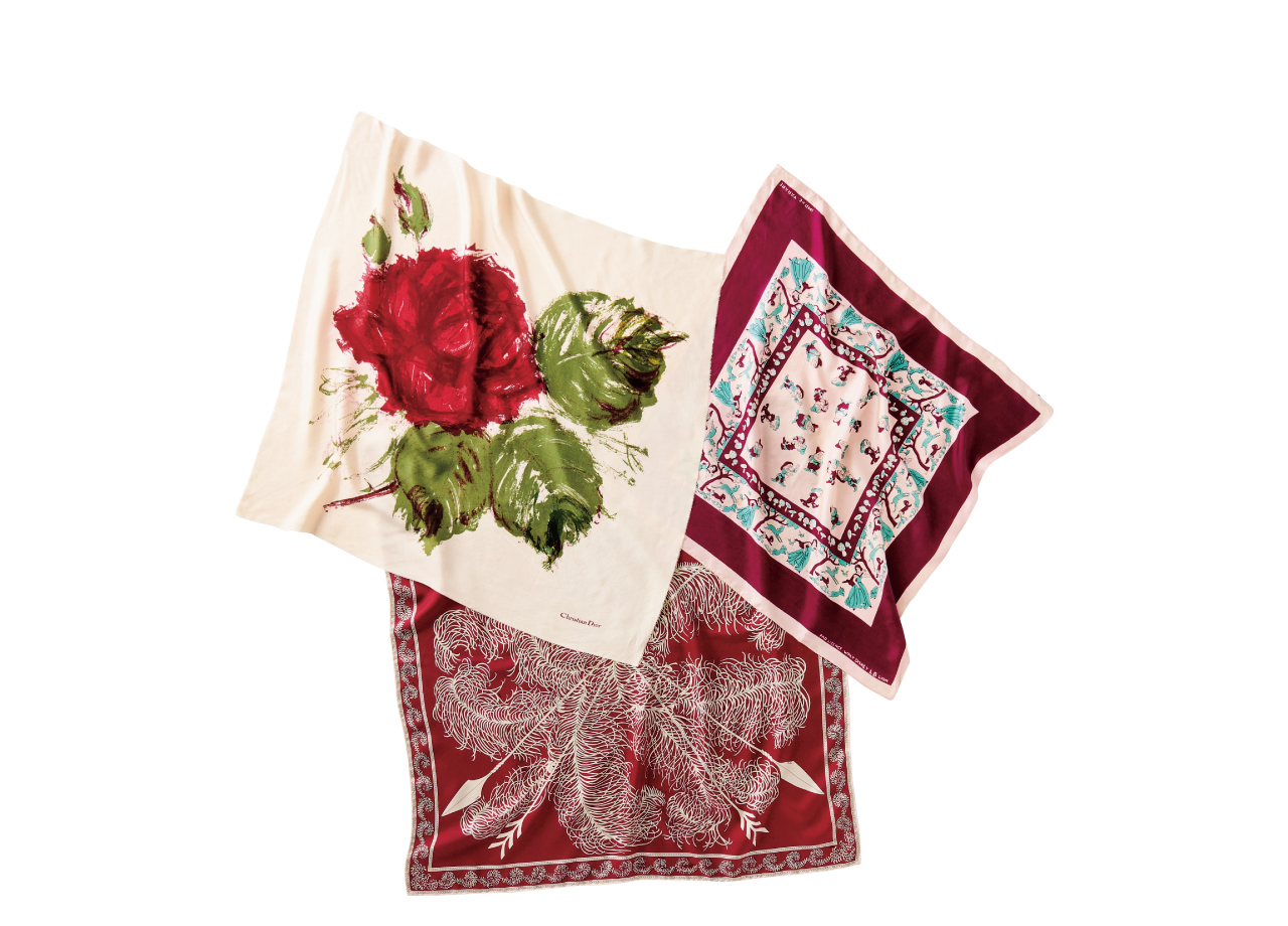 スカーフは、誰が何のためにこんなに凝った絵柄を描いたのだろう、馬鹿馬鹿しいけれど美しく、つい笑ってしまう。ヨーロッパでは、若かりし日のルル・ド・ラ・ファレーズのように頭に巻き、柄オン柄の過剰な装いに、赤い口紅を。赤いスカーフが多いのは、顔まわりが赤いとリップとのバランスが取りやすいからなんです」
