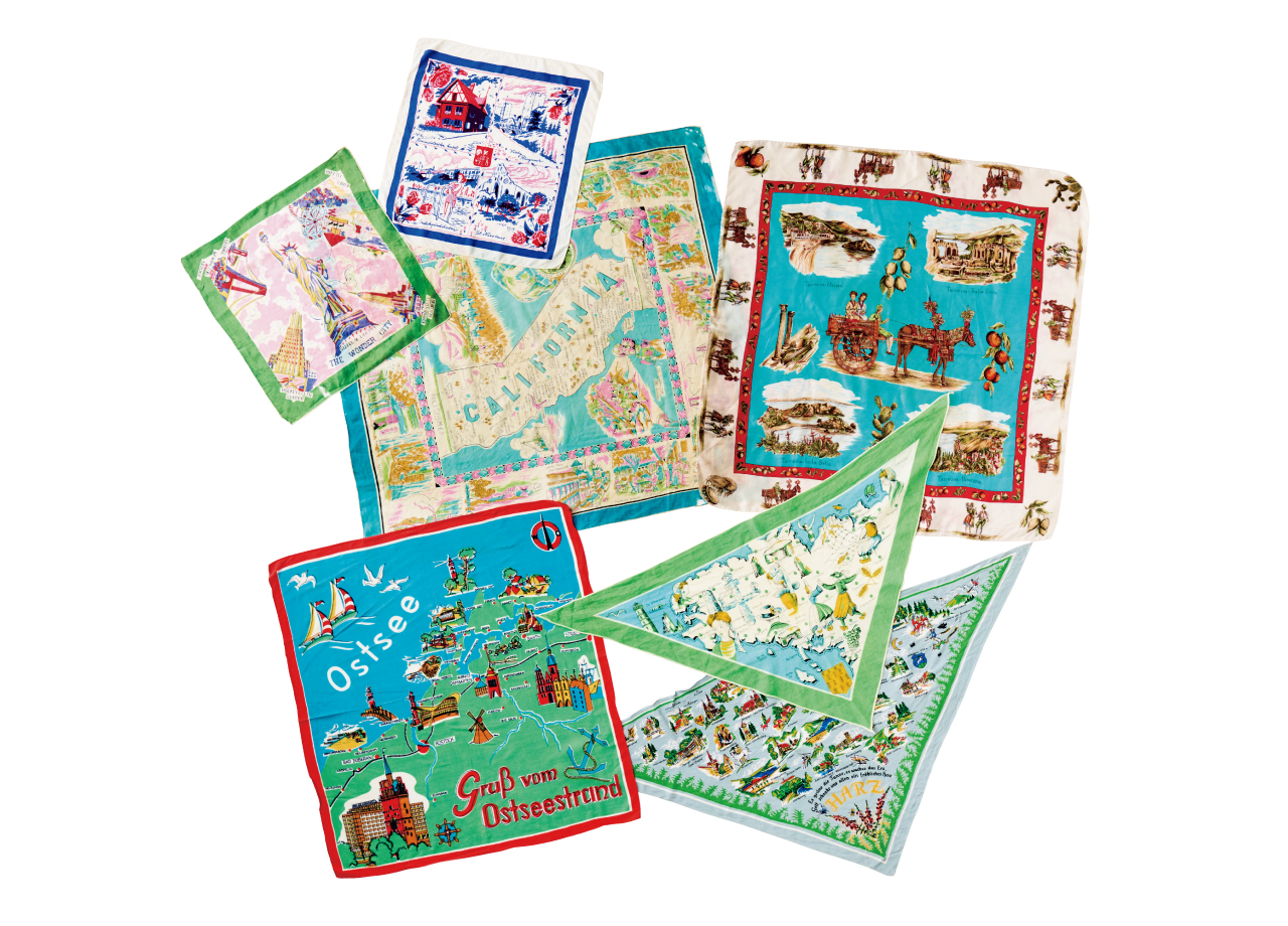 (写真左上から時計回りに)NYの名所、スイスの山風景、カリフォルニアの名所、イタリアのタオルミナの景勝地、モン・サン・ミッシェルの地図、ドイツの町ハルツの地図、バルト海とドイツの地図の柄のお土産スカーフがお気に入り。未踏の地でも図柄を眺めるとわくわくします。特にタオルミナの古い歴史を物語る絵が素敵。イオニア海のブルー、見に行きたいです」