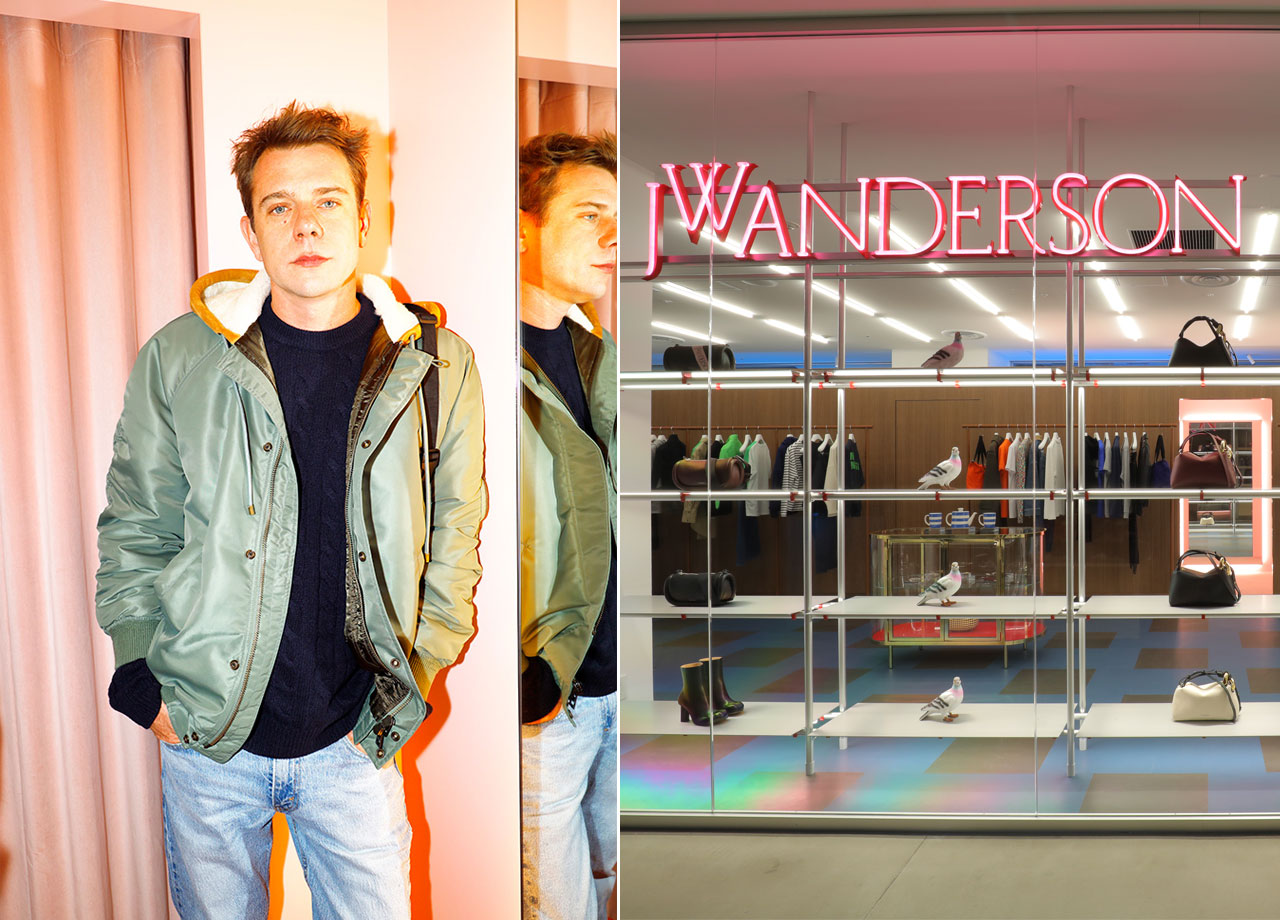 ブランドのシグネチャーであるロゴを象ったネオンサインや、アルミニウム製の棚、ペトロール・ブルー×ブラックのチェッカーボード柄のフロアなど、ロンドンのナイトライフカルチャーや、イタリア・ミラノのクラフトマンシップを感じる要素が散りばめられた楽しげな空間には、メンズとレディスのウェアに加え、バッグやシューズなどがフルラインナップ。また思わずセルフィーしたくなるピンク色のフィッティングルームも必見だ。このオープンを記念して来日した創始者兼クリエイティブディレクターのジョナサン・アンダーソンにインタビューをした。