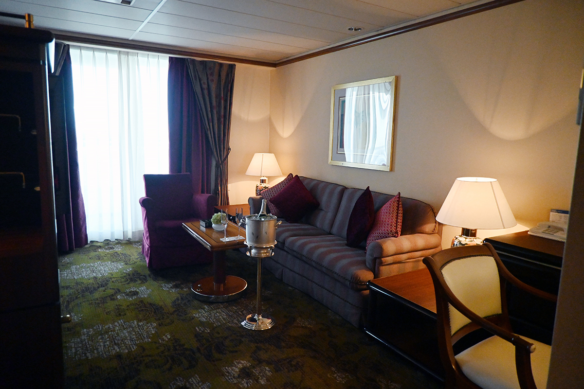 キャビンの最上階10デッキには4種類の豪華なスイートタイプが。このクラスからは乗船時のウェルカムスパークリングワイン&お菓子や、ソフトドリンク&お茶類、ルームサービス、冷蔵庫にビールなど、特典が付いてきます。
