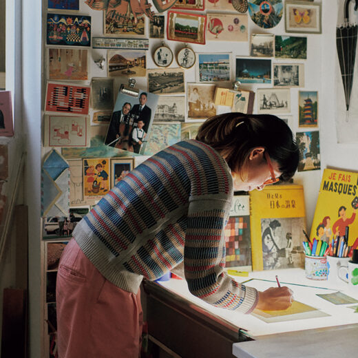 「2015年にリノベーションをし、内壁を一新。マーケットで見つけたシンクを取り付けました。ここではデザインやリサーチをして絵柄や仕様書を作成します。それらを工場へ送り、生産へと進めます。小さな会社なので、生産管理から販売まで全ての工程を自分たちでやっています」