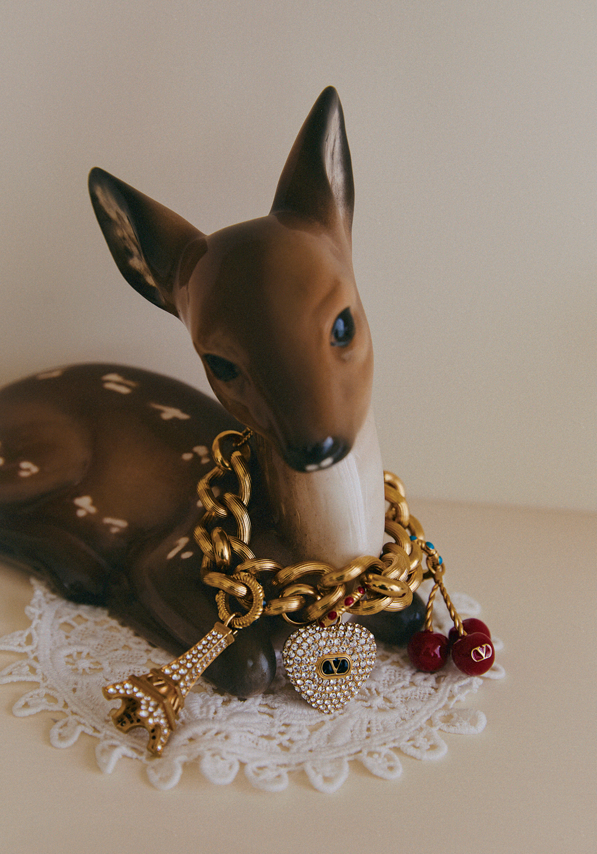 チェリー、ハート、エッフェル塔のプレイフルでキッチュなモチーフが連なったブレスレット。ハートとエッフェル塔にはスワロフスキーが使用され、煌めきが一層増している。ロマンティックな雰囲気に誘われて、気分も華やぐアクセサリー。