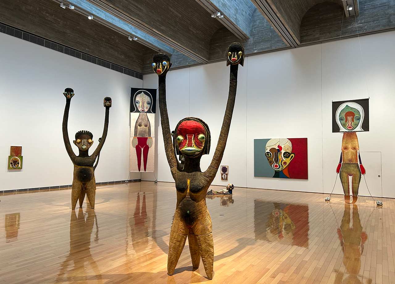 キャンバスに描かれた平面の作品から布を使ったタペストリー、木彫やソフトビニール、鋳造による立体作品まで、多彩な素材で表現された数百体の「人がた」たちはまるで島根の地に宿る八百万の神々のようにも見えてくる。「人がた」の正体について加藤はいつも「観る人に解釈を委ねたい」とするが、今回設置された作品群は、特に神秘性を帯びて見えてくるようにも感じられた。