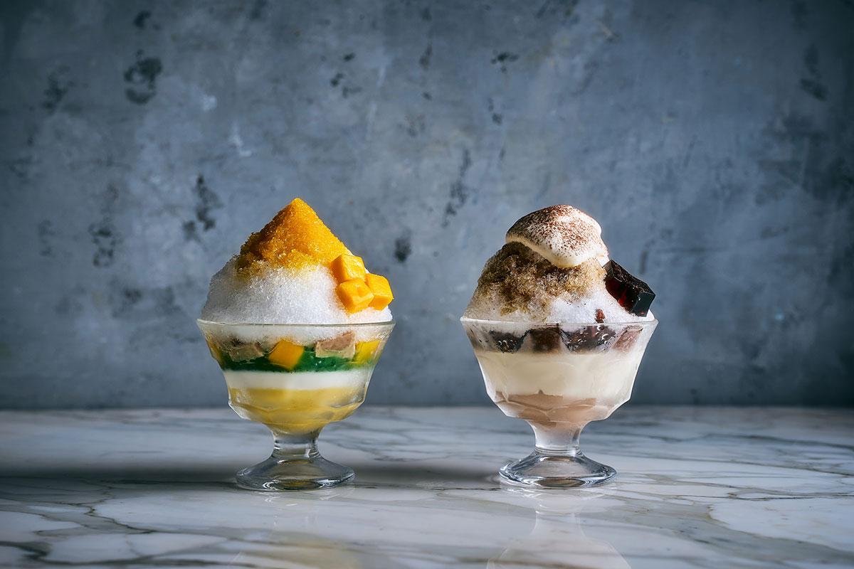純水から削り出したふわふわの氷に、繊細なスイーツの層を重ねた2種のかき氷。「スイーツかき氷 コーヒー」は、コーヒー豆を漬け込んだ生クリームムースやティラミス、クッキー生地などを重ねた、大人のための一品。トッピングと氷の中には、約7時間かけて抽出したコールドブリューコーヒーで仕上げた本格コーヒーゼリーを使用している。「スイーツかき氷 マンゴー」は、マンゴーやココナッツ、ライム、レモングラスなど南国の香りが広がるトロピカルな味わい。下層にはマンゴープリン、パンナコッタ、ゼリーを重ね、異なる食感がアクセントに。
