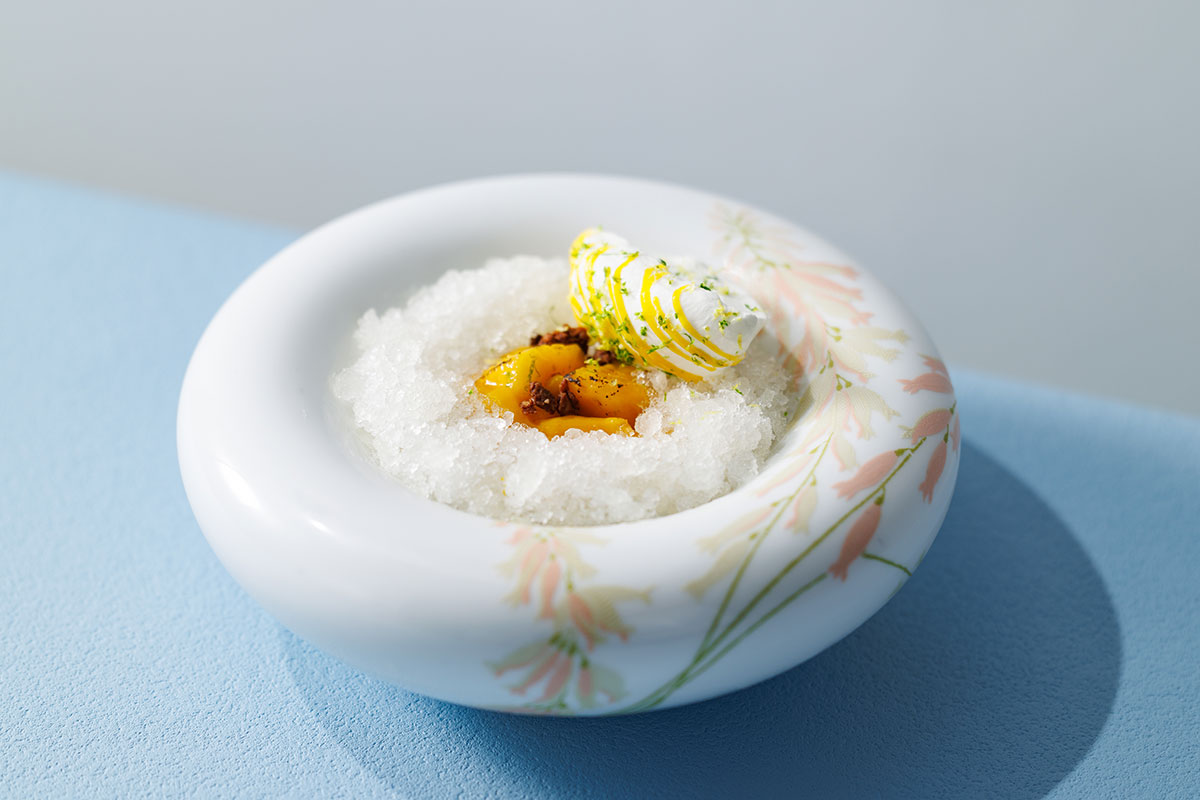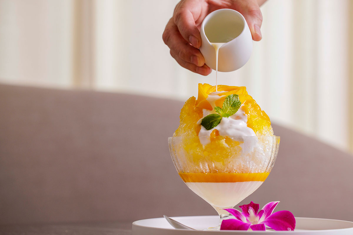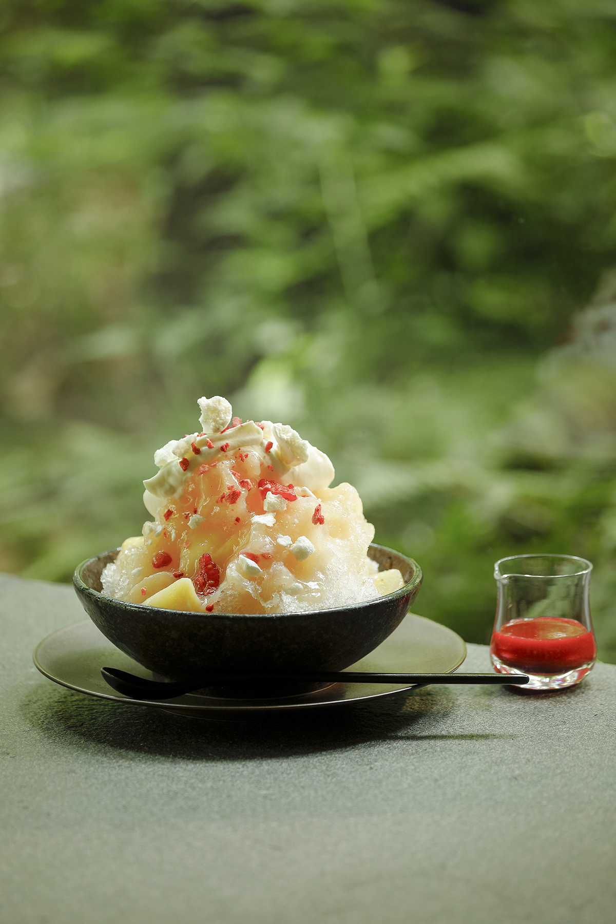開業以来初となるかき氷が登場。ふわふわのかき氷の下には、マンゴーゼリーとパンナコッタを忍ばせ、異なる食感が口の中で広がる。濃厚なマンゴーピューレに加え、パッションフルーツ、ライム、パイナップルをブレンドした爽やかなピューレは別添えで。味の変化を楽しみながら最後まで飽きずに楽しむことができる。トップには、バラの花をかたどったマンゴーを華やかにトッピングし、見た目にも美しい一品に。