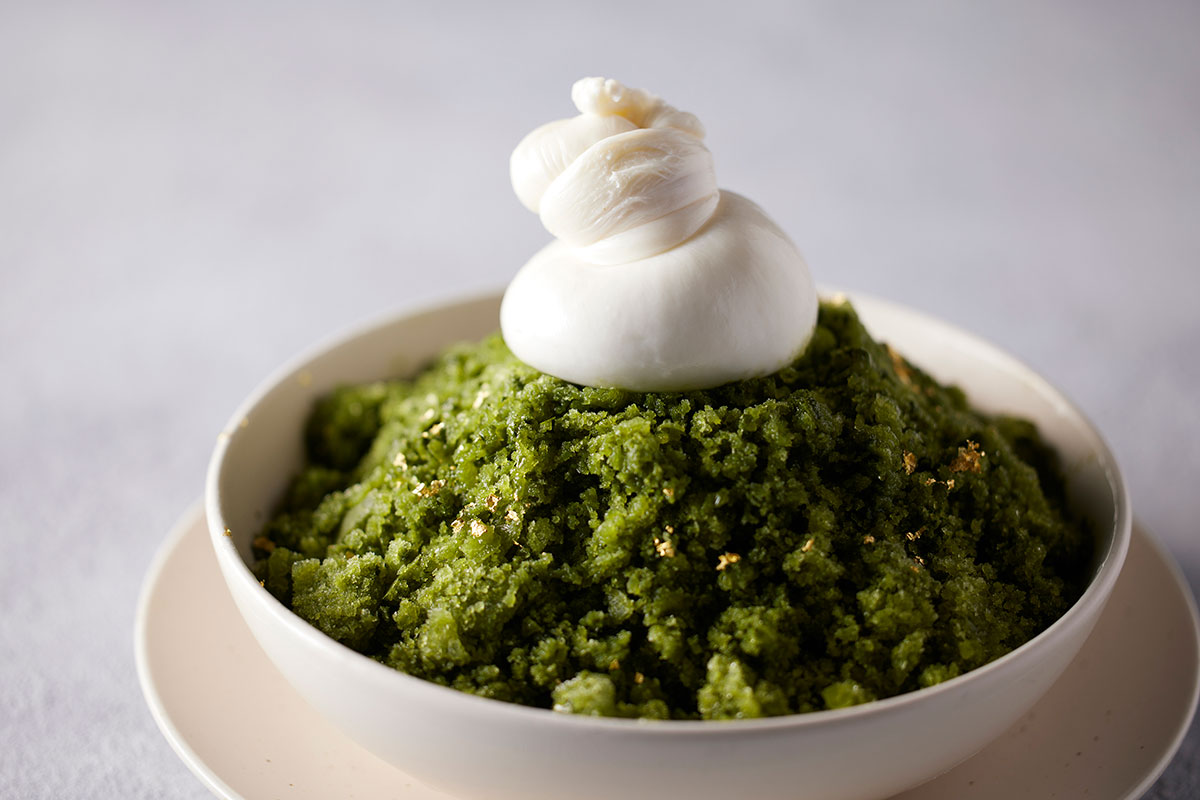老舗和菓子店「空也」の姉妹店「空いろ」の餡と、「FRESH CHEESE STUDIO」のブッラータチーズが融合した和×洋の新感覚スイーツ「あんぶら~た」を贅沢に使った、期間限定&数量限定のかき氷。抹茶のグラニテをベースに、抹茶アイスとバニラアイス、北海道産ホイップクリーム、白玉、銀座由来の甘納豆を重ね、なめらかでミルキーな「あんぶら~た」をトッピング。別添えの「追い抹茶」をかければ、爽やかな苦味が加わり、まるで宇治金時のような風味に変化する。一日5食限定なので予約必須。