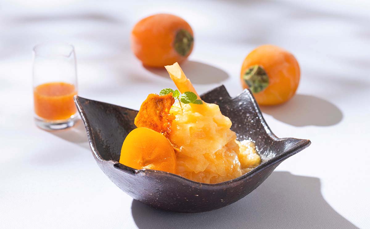 中国料理「星ヶ岡」の新作“柿のかき氷”は、まるごと凍らせた島根県産「西条柿」を使った、果実感あふれる贅沢な一品。とろけるような果肉の甘みと、ふんわり軽やかなスノーアイスが重なり、やさしい甘みと、みずみずしくとろけるような口あたりが広がる上品な味わいに。仕上げの完熟柿シロップが、柿本来の奥深い風味をさらに引き立てる。かき氷の素材としては珍しい柿を使った、夏ならではの特別な味わいをぜひ。