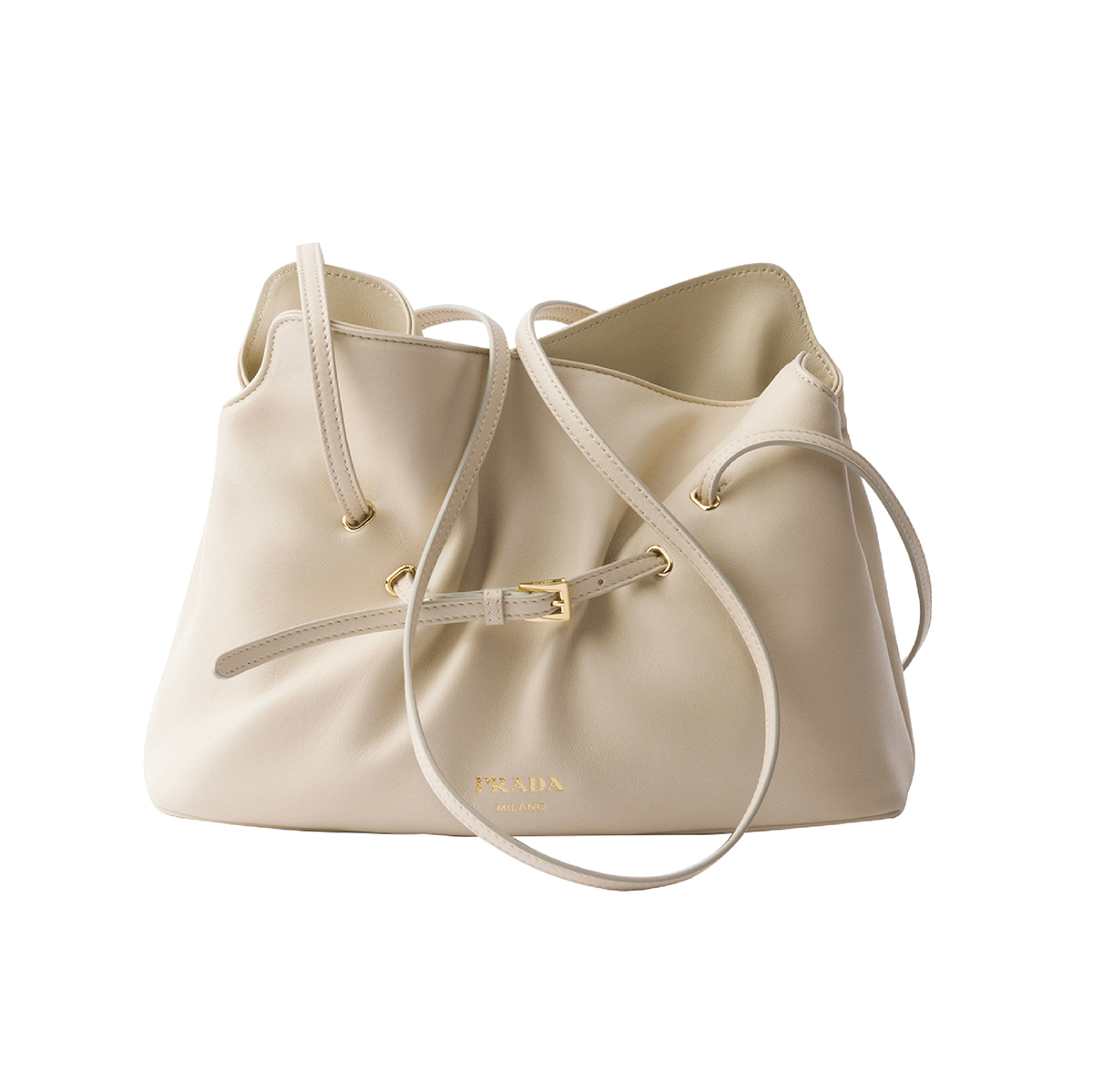 ベルトでギャザーをよせた形がユニークなバッグ(H10.5×W25×D18.5cm)¥418,000(予定価格)/Prada(プラダ クライアントサービス)