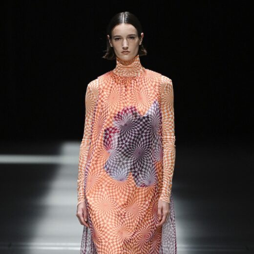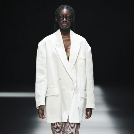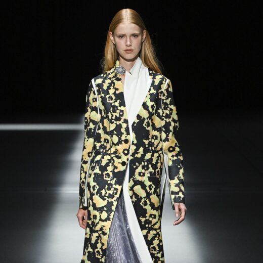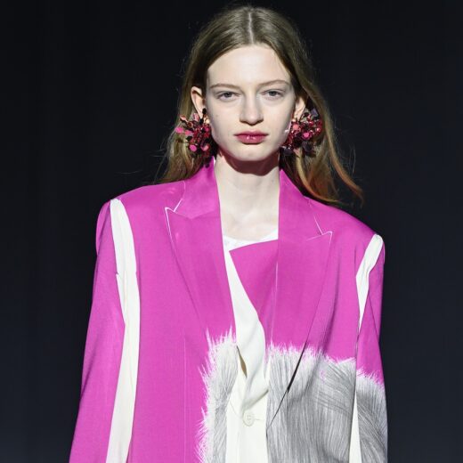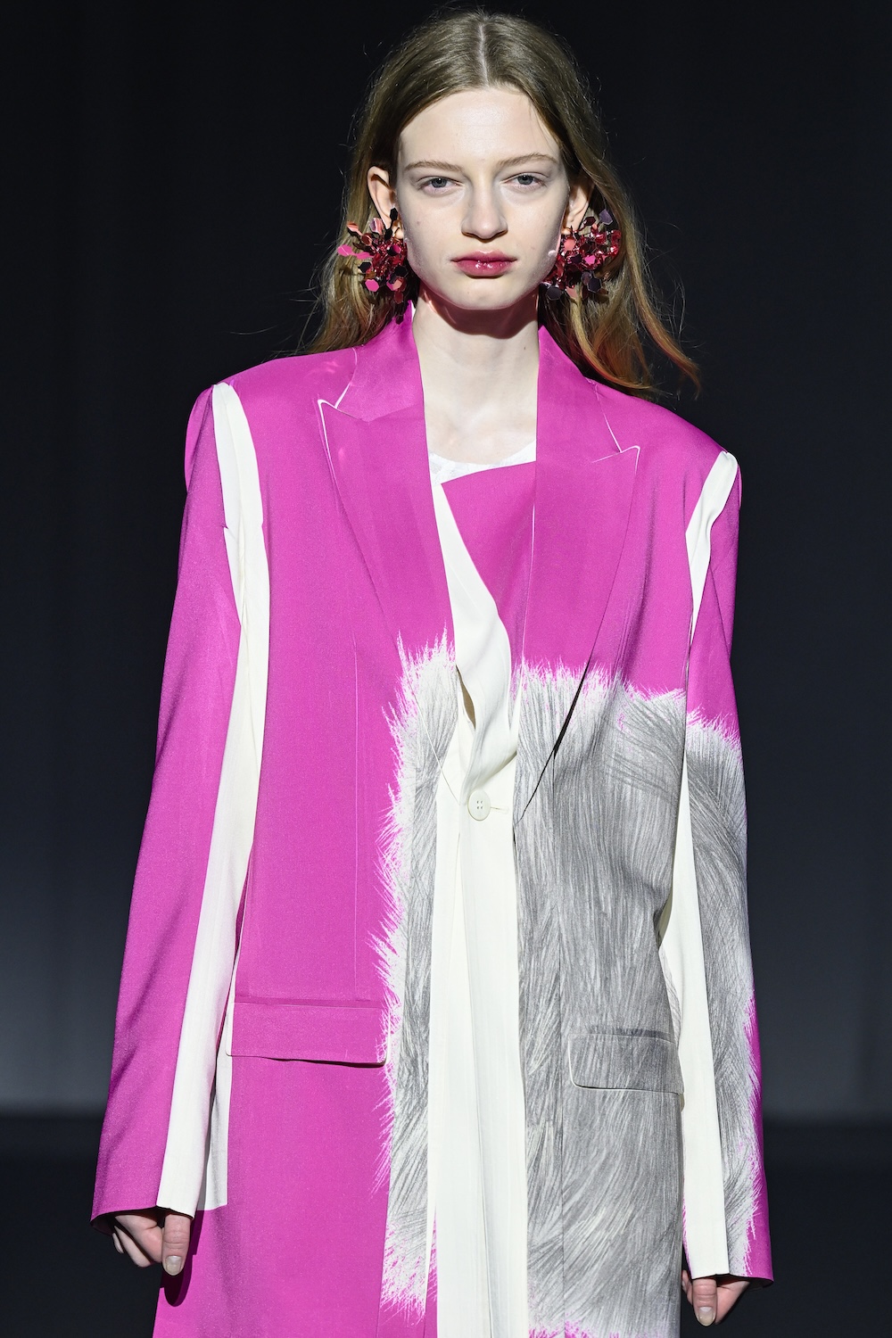 「クリーピーですよね。染めではなくプリントなので水を使わなくていいというメリットもあります。ピンクジャケットの素材はリサイクルポリエステルですが、ファーストルックに出した黒のジャケットのほうはシルクウールです。シルクウールは折り目が残らないので、一度生地を樹脂に浸す加工を施してから縫製しています。そのあとの工程は同じ。シルクウールは、横ハリがあるぶん、その反発感が美しいんです。実際に着た時、その感覚の違いを楽しんでもらえたらなと思います」