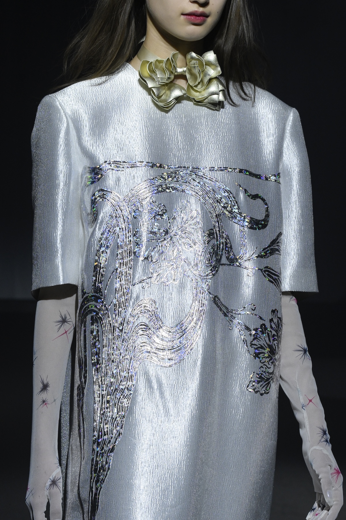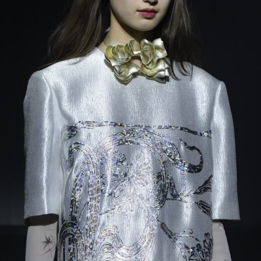 「アップリケを重ねているように見えますが、チェーン刺繍、スパンコール刺繍など、すべてデータでプログラミングされていて、機械でやっています。刺繍は平面の生地をデザインするのが通常ですが、もっとアクセサリーっぽく、刺繍を超立体化するというのをやりたかったんです。設計図を描いて、そこに手刺繍も組み込み桐生にある老舗の工場でつくりました」