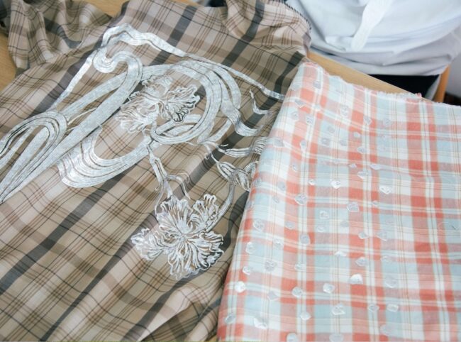 「生地の上に鉄がのっているイメージで、滋賀の染め工場で施した発泡プリントに京都の箔プリントをのせ2種類の技法を組み合わせています」