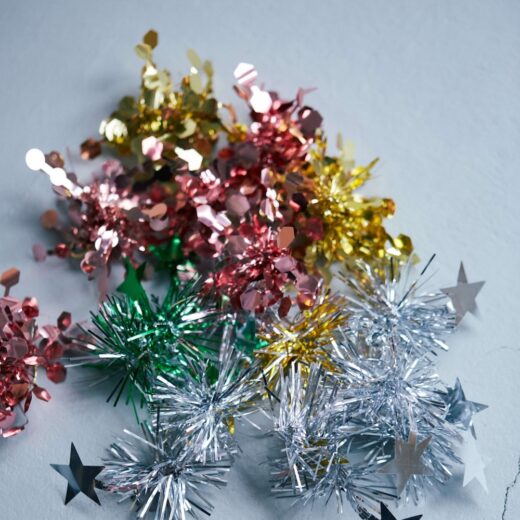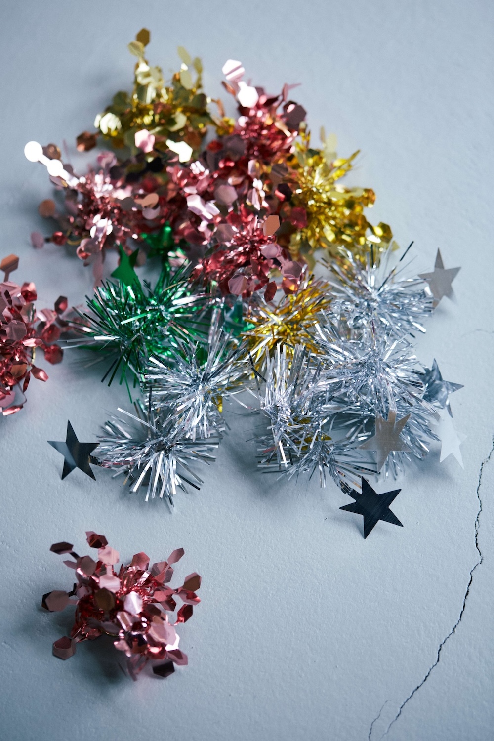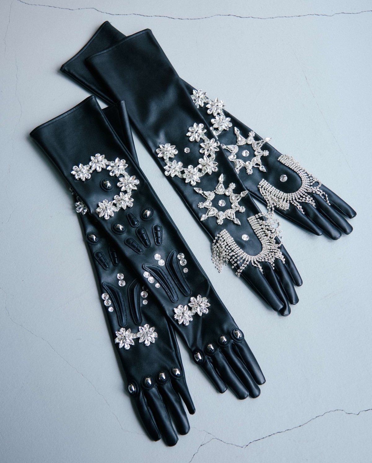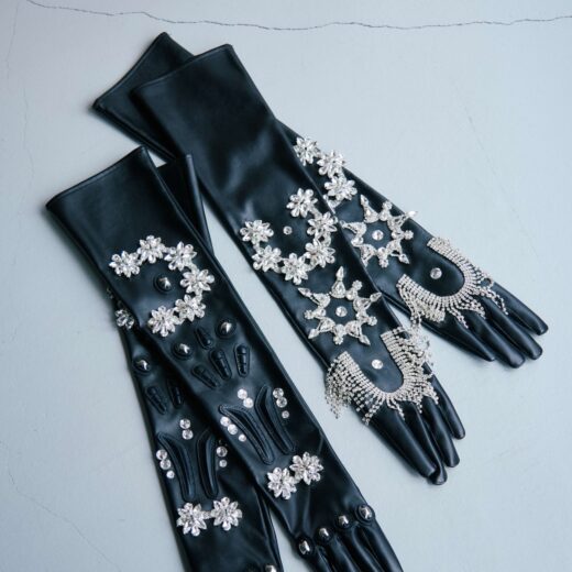 左:ショーの演出のためにパーティのデコレーション用モールで制作したアクセサリー(非売品)。右:スタイリングのポイントになっていたビジュー付きロンググローブ。Numero CLOSETにて販売予定。