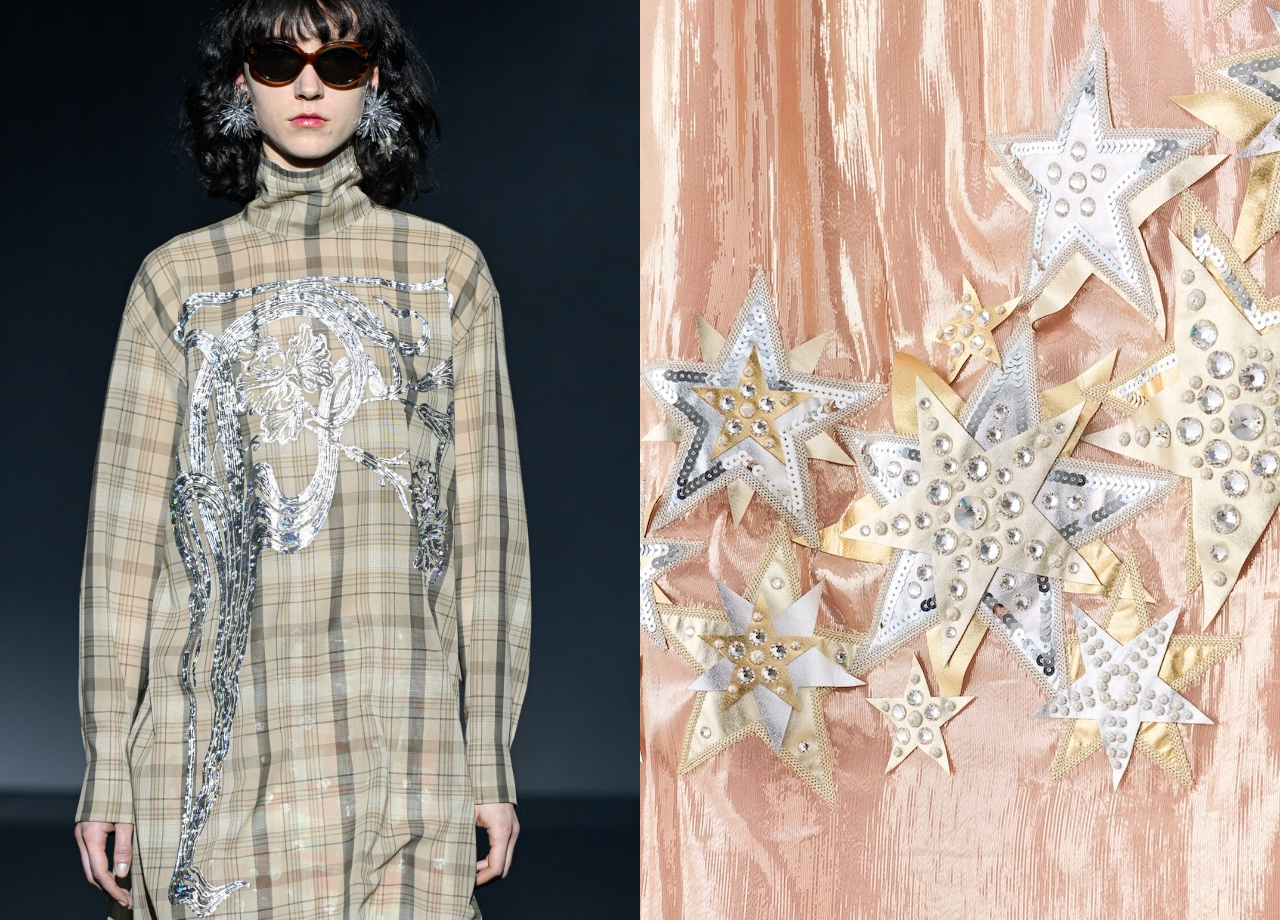 左:チェーン刺繍、スパンコール刺繍など様々な手法の刺繍を用いて立体化した星モチーフが印象的なミニドレス(NumeroCLOSEにて販売)