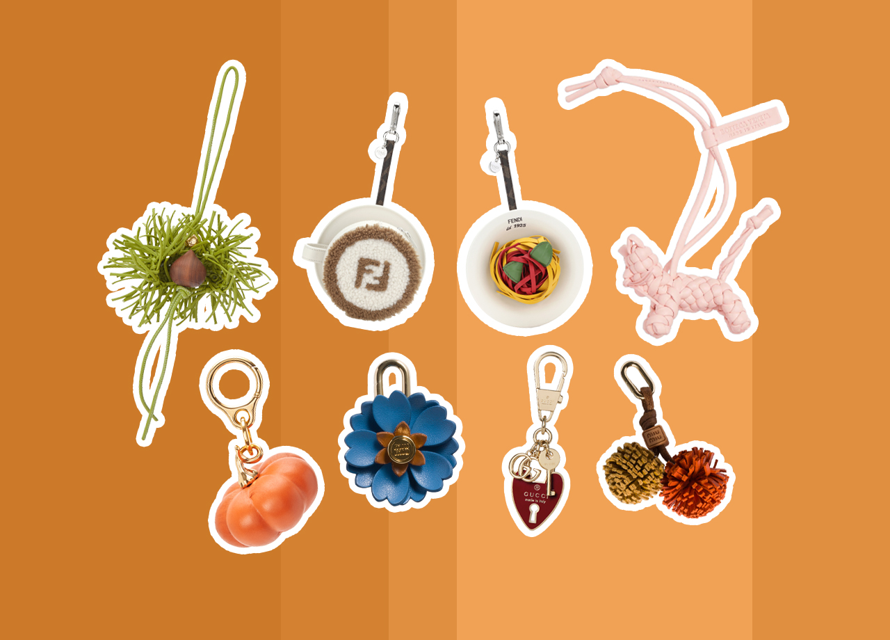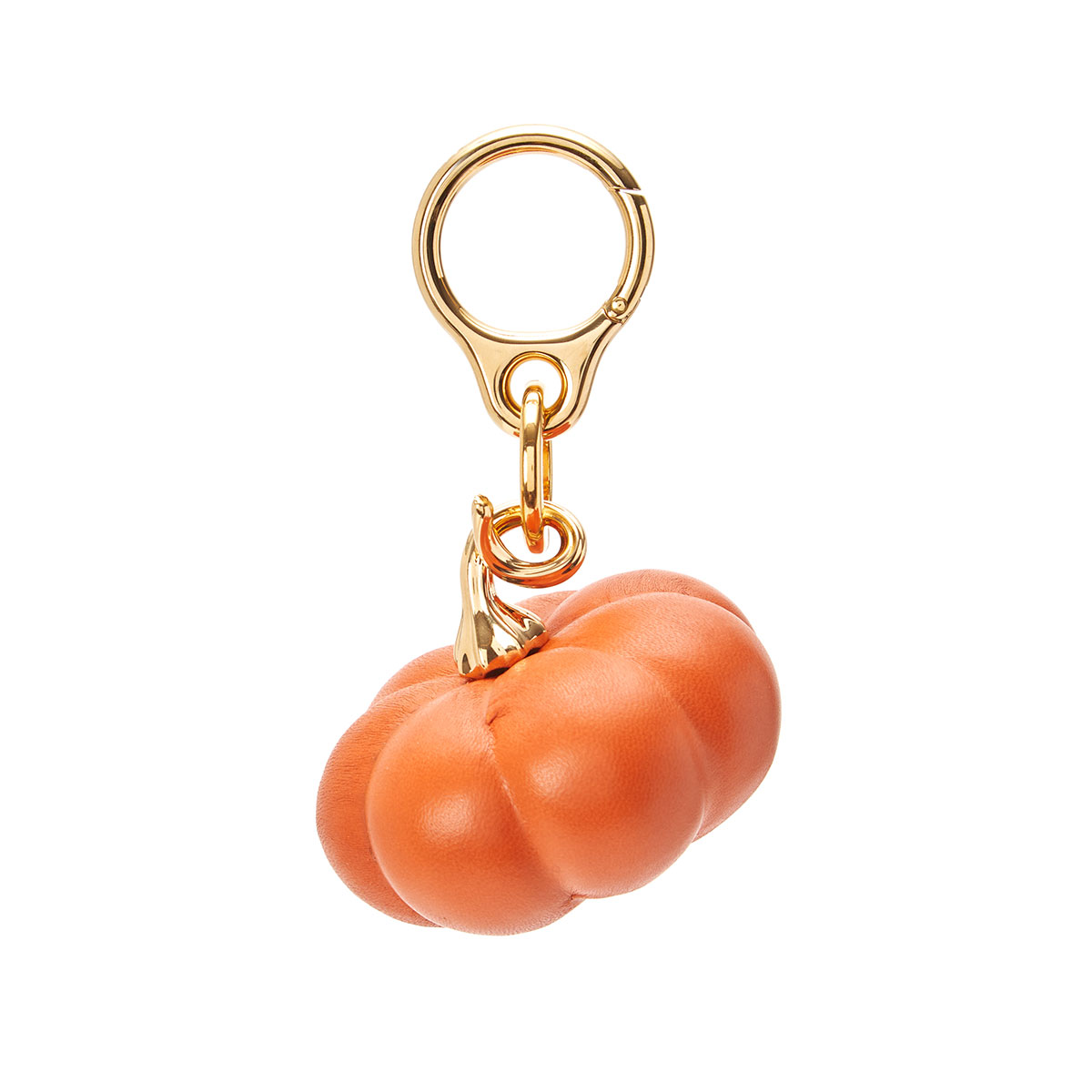 ロエベの人気チャームに秋を感じさせるモチーフが仲間入り。カーフスキンのフリンジに包まれたウッド製の栗に、ラムスキンを使用した本物そっくりなパンプキン。バッグに付けるだけで、たちまち季節感を演出してくれる。