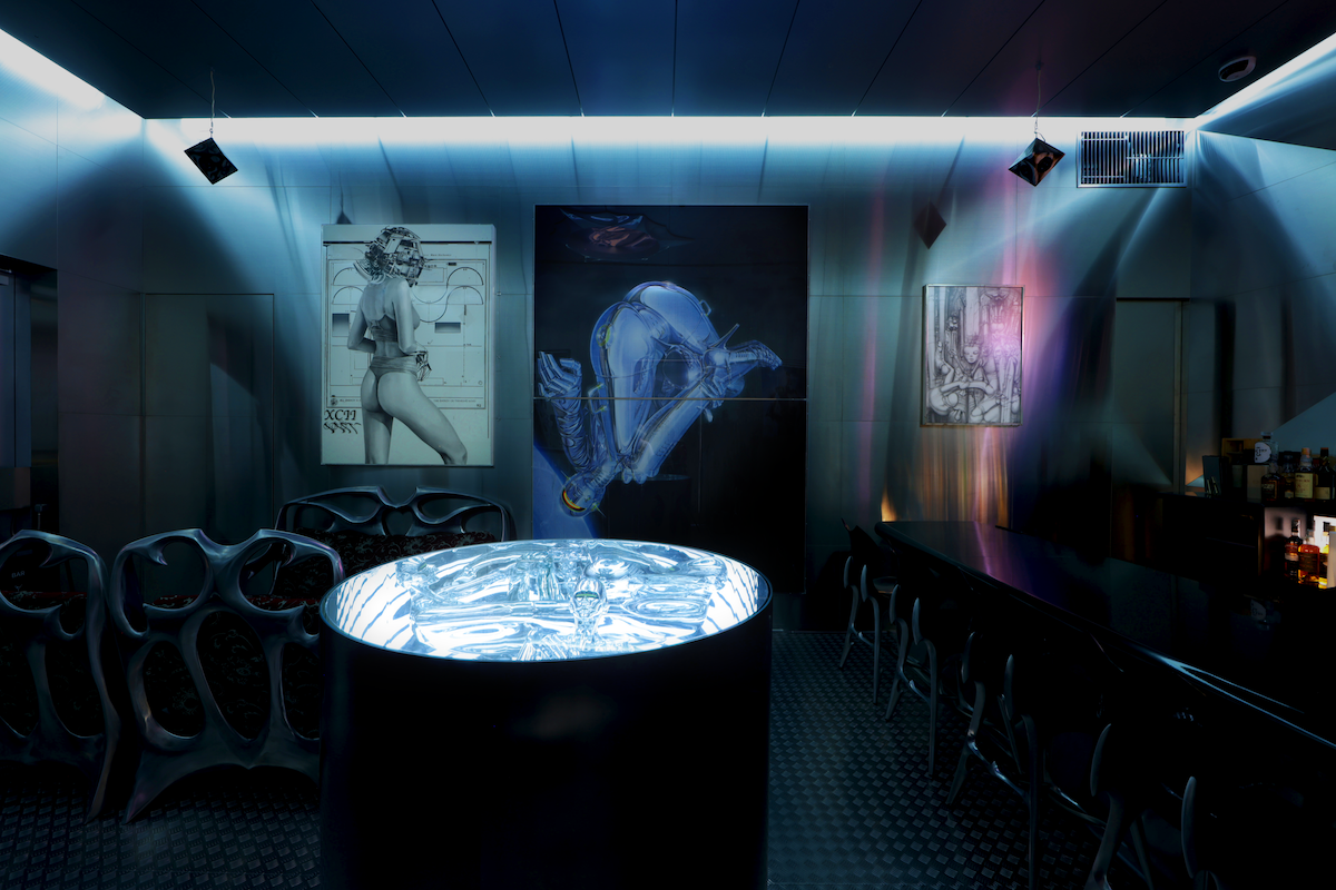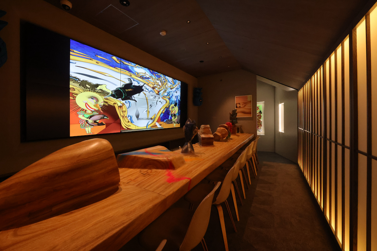 薄暗い室内の中心で光り輝くのは、空山基の作品を取り込んだスタンディングテーブル。バーカウンターの大型モニターにも同じく空山基の映像作品が上映されるほか、ダニエル・アーシャム、佃弘樹らの作品が展示されている。中村哲也が制作したというソファーやバーカウンター、カウンターチェア、ドアノブなどの家具にも注目してほしい。