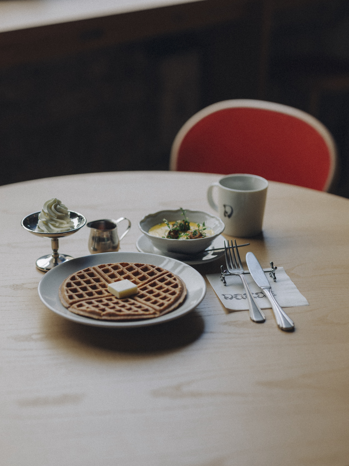 カフェ「CAFE DANCE」は、落ち着いた空間で一日中ドリンクや料理を楽しむことができるオールデイカフェ。朝食やブランチにはホームメイドワッフルを中心にしたカフェメニューを、夜はナチュラルワインとタパスを提供する。少し特別なモーニングにも、1日の締めくくりの一杯にもぴったりの場所だ。