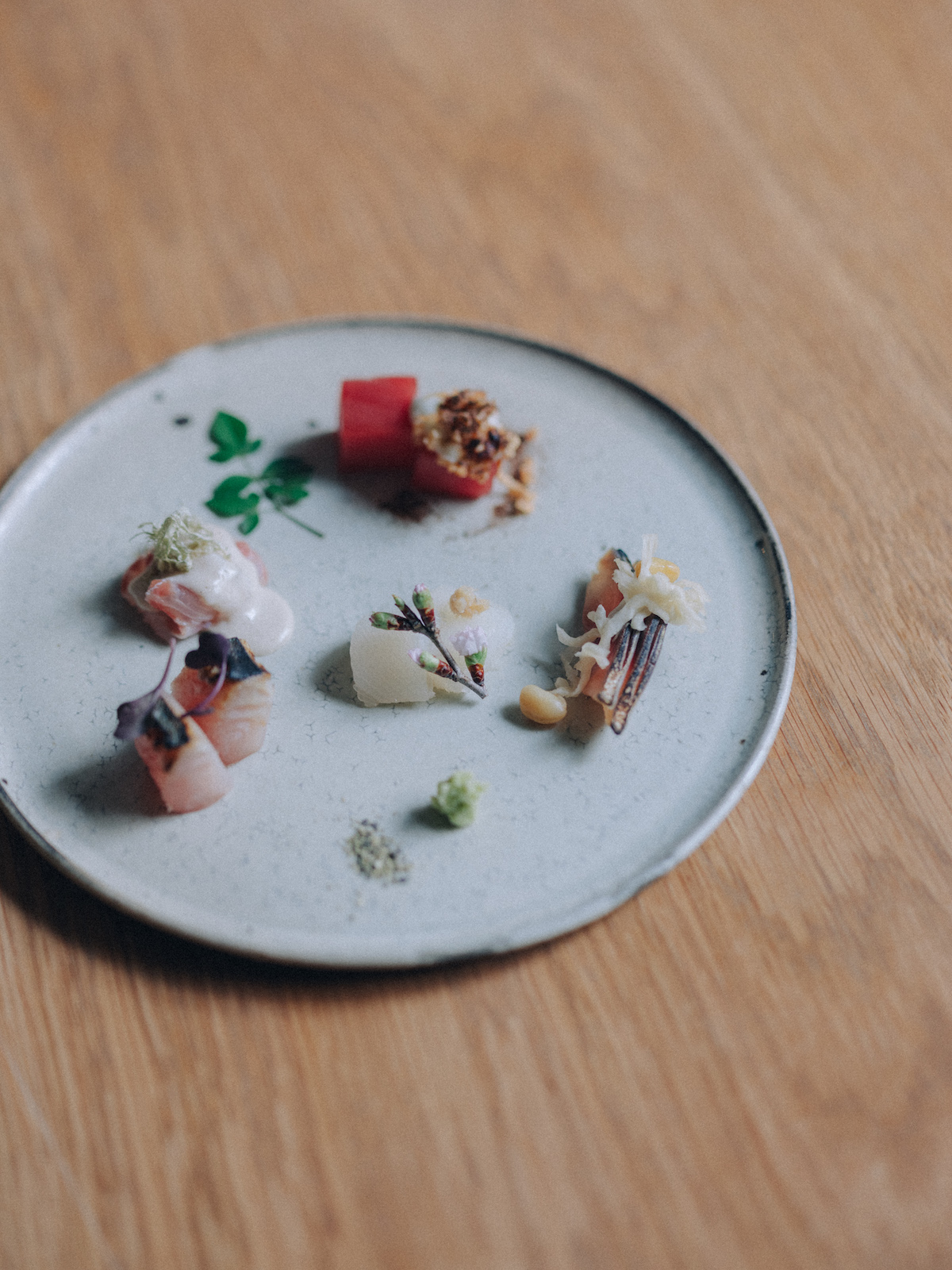 ソニーが企画・運営するカジュアルダイニング「1/2(Nibun no Ichi)」は、銀座の街中にある数々の飲食店でも楽しんでほしいという思いから、一人前の約1/4サイズの料理を2品盛り付けたプレートを提供。ここでも、銀座の街を楽しむための「余白」が感じられる。