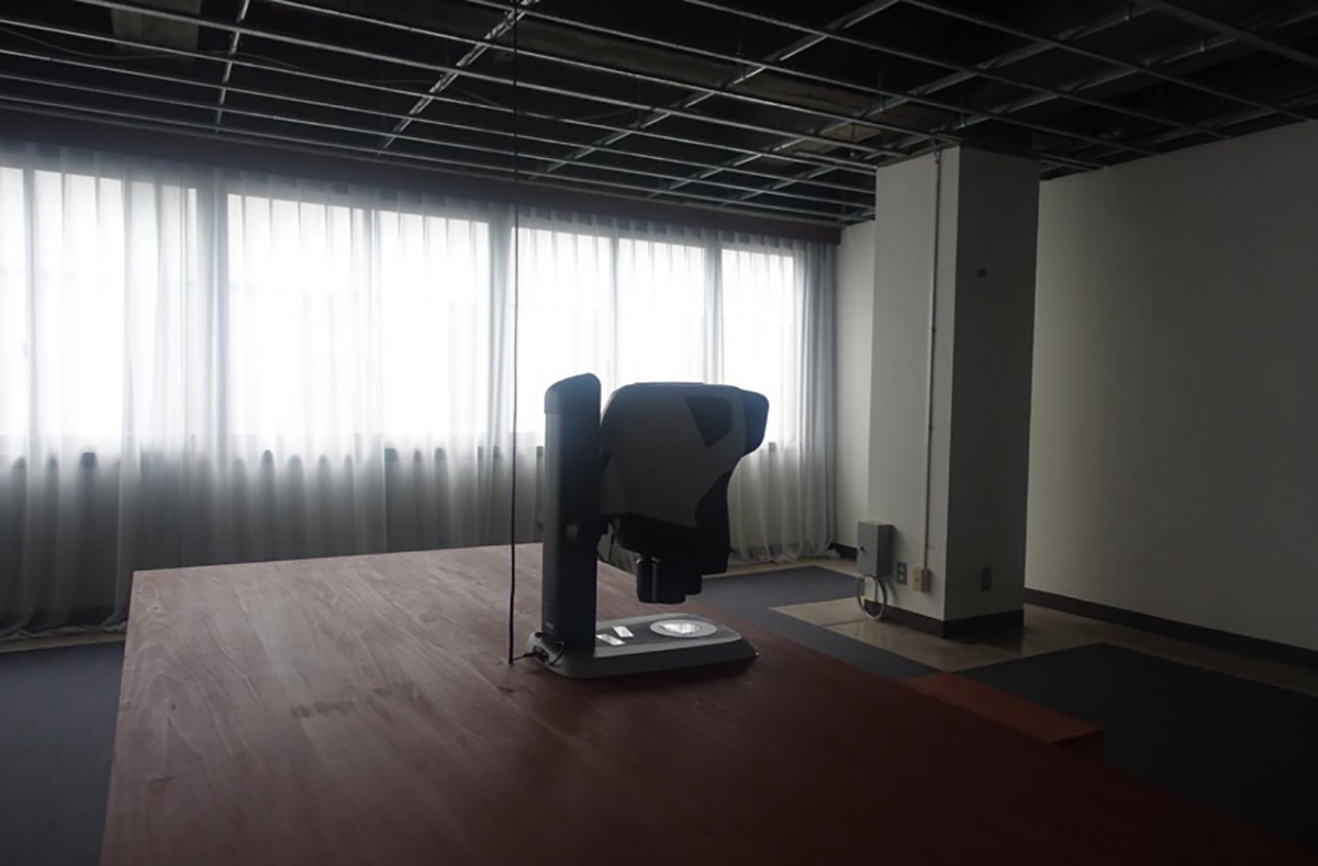 雷電館では、詩人としても活動するプレシャス・オコヨモンによる精神分析の診療室、『実在探偵社(岡山)』(2025)を展開。フロイトやユングといった精神科医の部屋を思わせるしつらいで、壁面にはオコヨモンがセレクトした恋愛、哲学、詩などジャンルさまざまに本が並ぶ。週末になると白衣を着た「実存探偵」がいるため、遭遇したらぜひ一声かけてみてほしい。