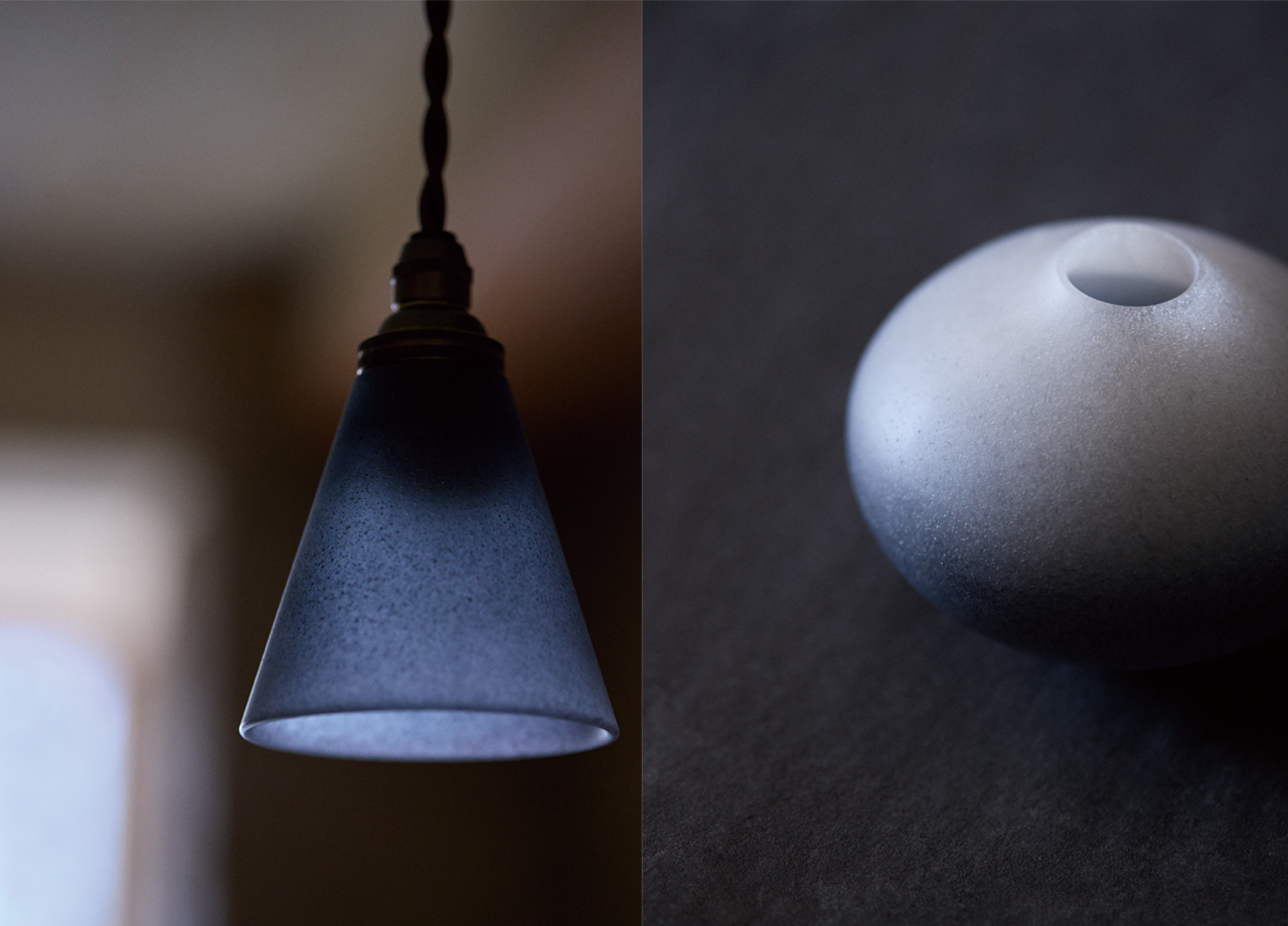 こだわり抜いたラインが生み出す口当たり、触感の心地よさは、使うことによって優雅な体験をもたらす。波多野の作品は道具でありながら、伝統工芸とガラスの持つ儚さを内包し、天然石のような穏やかな質感と、深遠なグレーの世界を漂い続ける。