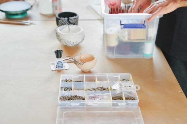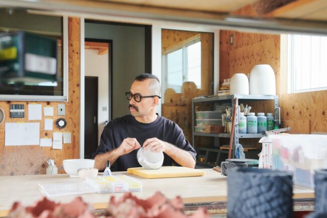 「陶芸では釉薬を用いた装飾が一般的です。僕も学生時代に一通り学びましたが、そこにあまり魅力を感じませんでした。というのも、釉薬の美は何千年もの歴史の中で確立され、もはや完成された領域です。それを今の時代に落とし込み表現するという方法もありますが、僕が関心をもったのは、今だから成立する新しい表現です。新しい表現技法で、かつ装飾的なものを探りたい。一見奇抜に映るかもしれないけれど、これもひとつの美として成立していませんか、という提案を続けたいと思っています」
