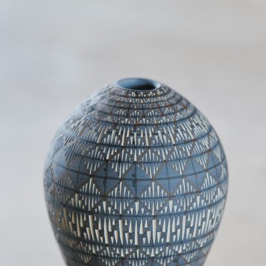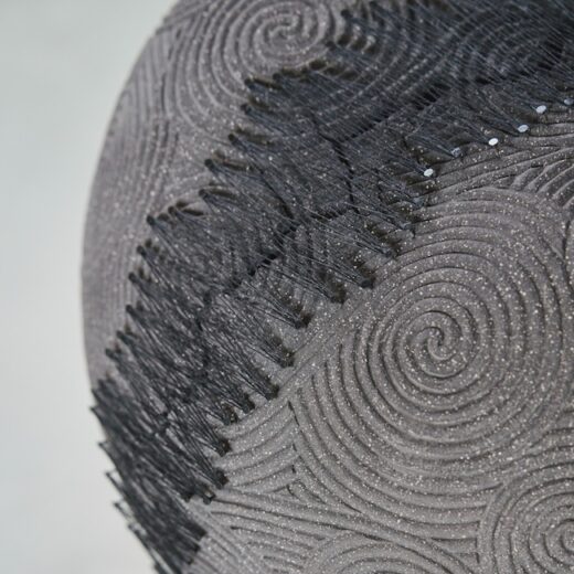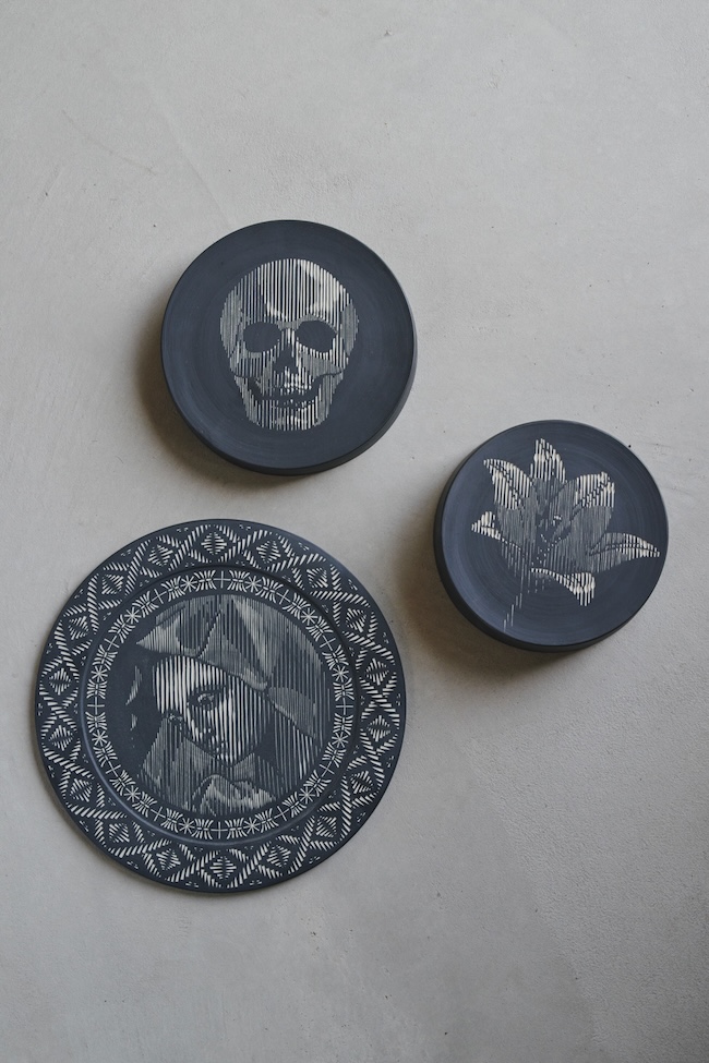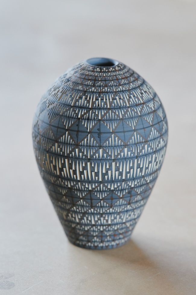 「版画からイメージを膨らませたところもあります。彫刻刀の入れ方や深さによって、濃淡を表現できるし、彫ることによって模様をつけることは、ある種タトゥーにも通じます。『MYO』は粒子の細かい磁土を使用し、粘土を半乾きの状態で表面を削ります。刃が粘土を削る感覚自体も心地よく、それが制作の動機になっている部分もあるかもしれません。『Dress』は感覚に従って糸を巡らせる即興性という側面がありますが、この作品は、この部分にこの模様を入れようと設計を起こしてから作業を始めます。設計やデザインの工程が大きな比重を占めています」