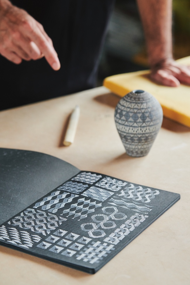 「ノートに図案をスケッチしています。ただ、ペンで描く線は均一な太さなので、実際に土に彫りながら、再度、スケッチに戻る、その往復で模様を展開していきます。また、平面で考えた図案を器の360度のフォルムにきちんと収まるかどうか、それも計算しながら進めます」