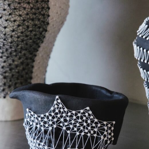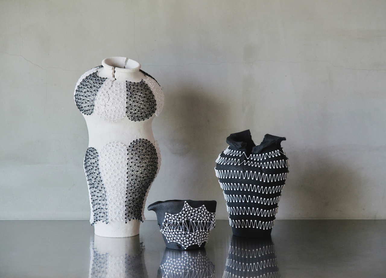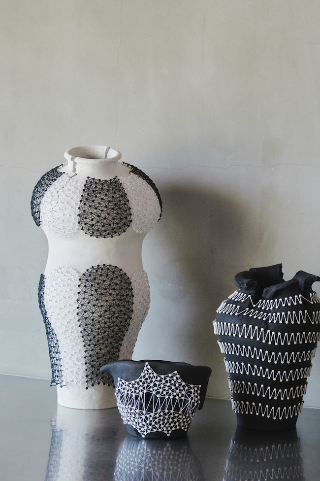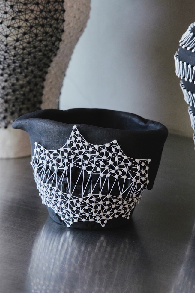 「糸は太さや質感が大きなポイントです。光沢や強度といった実用性も考慮しますが、一番は、糸を張ったときの配列の心地よさ。土台となる陶器も意図的です。表面の糸をより鮮やかに見せるために、黒または白で着色しています。器そのものに赤やピンクなどの色彩があると、そこに意味が生まれてしまう。ミニマルなモノトーンに絞り込むことで、作品のフォルムと糸のパターンを純粋に見てもらいたいと考えています」