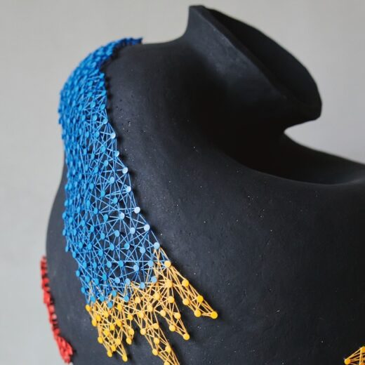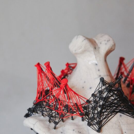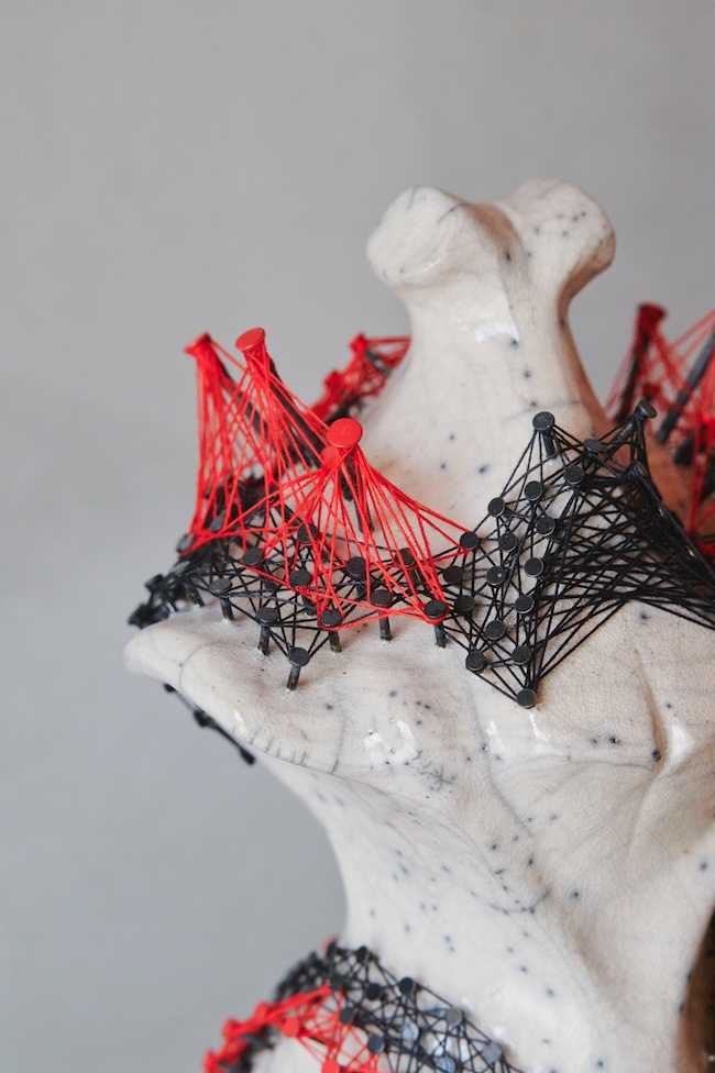 「6年ほど前、ある展示のテーマが“食器”だったんです。それをきっかけに、器のフォルムを保ちながら糸を張るという試みを始めました。それ以前は、人体のような抽象的な造形に糸を纏わせていたのですが、器という完成された形に装飾を施すには、必然性が必要だと感じました。そこで思いついたのが、器を“割る”という行為です。器をあえて崩すことで、釘を打ち、糸を纏わせることが意味を持ってくるのではないかと考えました」