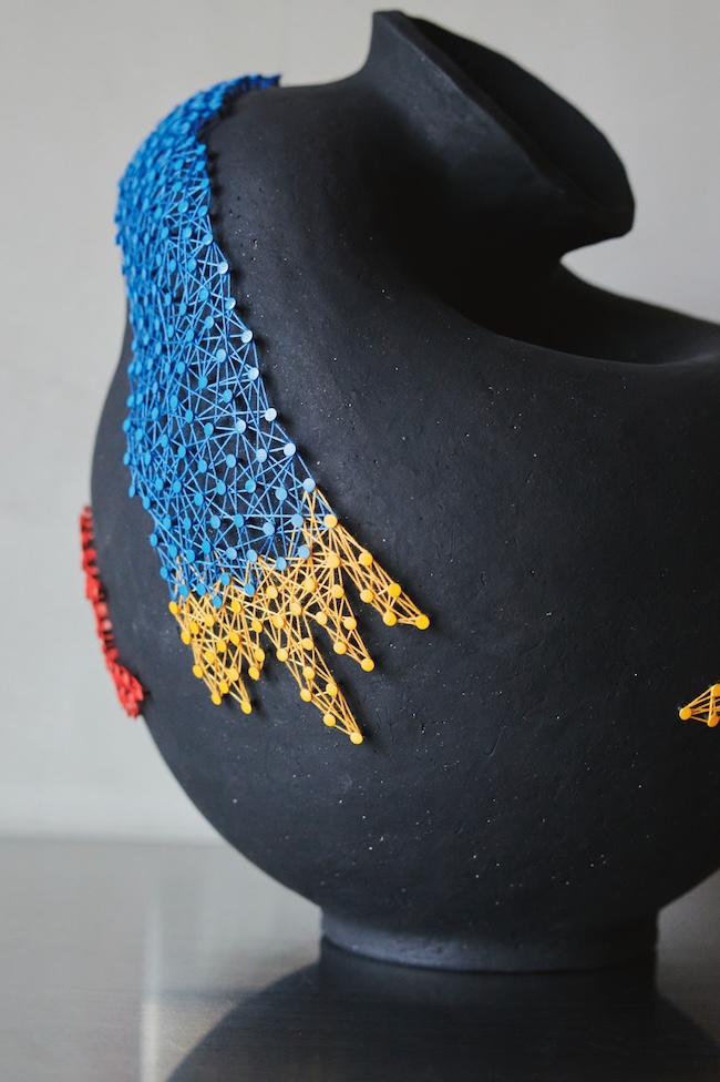 「まず器を作り、それを割る。ランダムに生じた割れ目やひびから、大まかなデザインが決まります。割れ方とフォルムの関係を見ながら、ここに釘を打ち、この方向に糸を通す、と墨で下書きしていく。その時点で、すでに糸のパターンはある程度、見えています。その後は淡々と糸を張っていく作業に没頭します。繰り返しのリズムは編み物に近い感覚で、一定の手の動きの中に心地よさがあり、何度も糸を巡らせることで濃淡が生まれ、新しい形が立ち上がり、それがまた次のパターンに繋がっていきます」