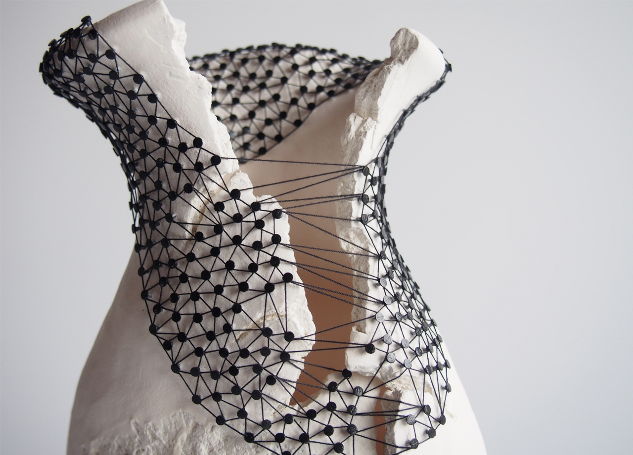 「dress /vase」割れ、破損をより魅力的に見せるためどう糸を纏わせるかを考えながら制作。