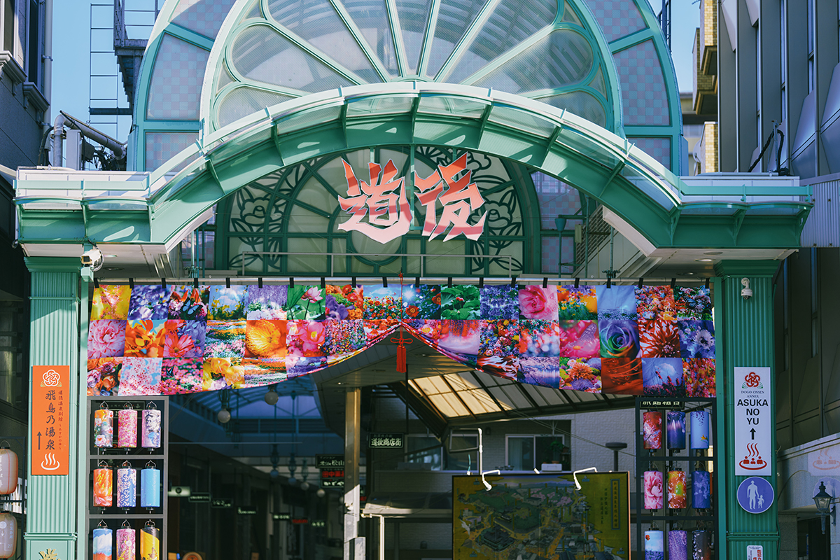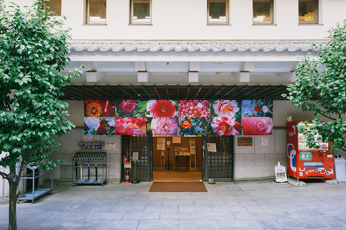 また、地元の人に親しまれる椿の湯のエントランスは、蜷川の椿の写真で彩り、道後温泉駅から道後温泉本館をつなぐ道後商店街の正面入口には、蜷川作品を全面に配した提灯と陣幕のゲートを設置して、訪れる人を出迎える。