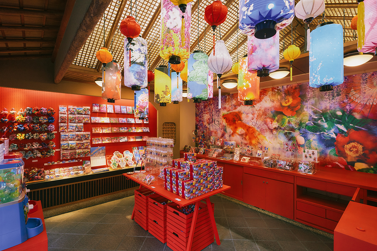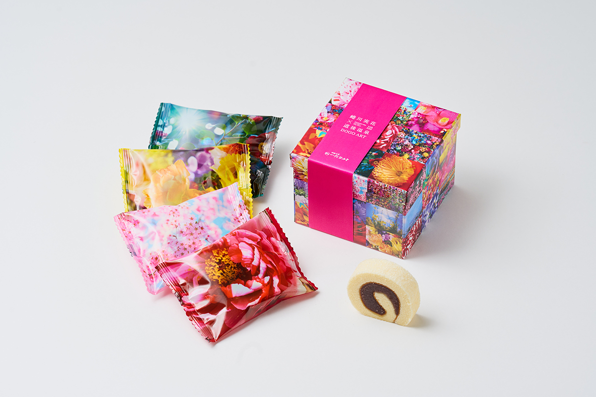 アート作品の展示にあわせて、道後温泉本館の正面にある一六本舗のショップが、期間限定の「蜷川商店(蜷川実花 with EiM × 道後温泉 DOGO ART オフィシャルショップ)」としてオープン。チャームを自由に組み合わせるイニシャルキーホルダーやステッカー、カプセルトイなどオリジナルグッズが並ぶほか、一六本舗とコラボレーションした「ひと切れ一六タルト柚子」も。蜷川デザインパッケージを一箱に詰めた特別仕様で、ここでしか買えないレアなアイテムだ。