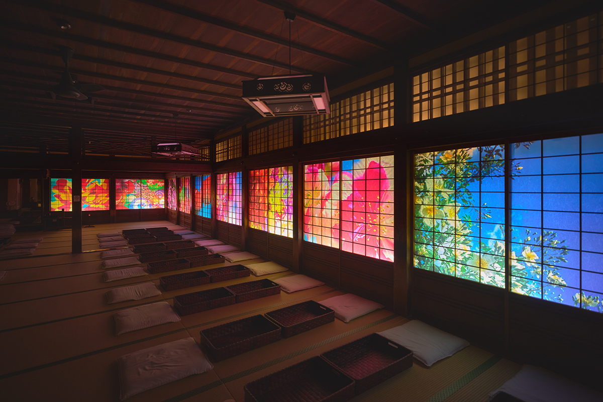 今回は「いのちの咲く湯-A Place for Blooming-」をコンセプトに「古代から神々を癒してきた道後温泉の歴史の記憶を花の姿に変えて表現したかった」と言う。本館正面(西側)のガラス戸や北側の障子に、四季折々の花々をはじめ、金魚や和傘など、蜷川の写真作品36点を配置。日中は柔らかな光を透かし、夜にはライトアップによって幻想的な輝きを放つ、ドラマティックな空間へと生まれ変わった。