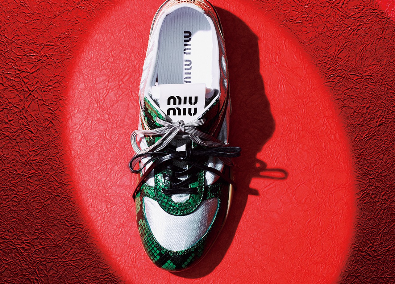 舞台に立ち、自らの一歩を試す。ミュウミュウの新作スニーカーは、スポーティなテクニカルファブリックと貴重なアイヤーズレザーで描かれたカラーブロックデザインを採用し、踏み出すたび力強さと自由を宿す。ジムナジウムスニーカーの超軽量シルエットを再解釈し、大胆なパイソンプリントが躍動感を際立たせる。可憐さと力強さを併せ持つこの一足は、自分のリズムで呼吸しながら、フェミニニティの新しい形へと進化する。