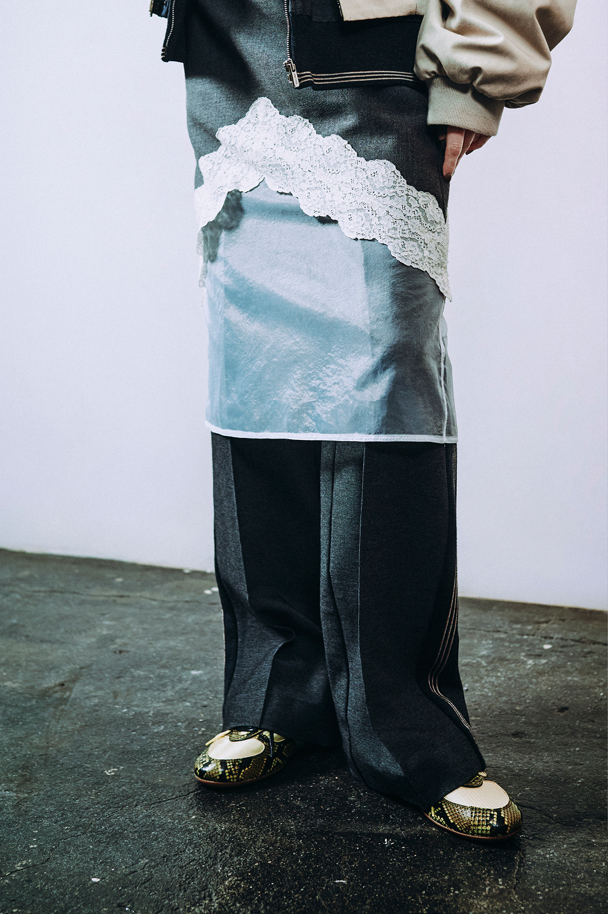 「ストリートの中にフェミニンを滲ませるようなスタイリングが好み。古着のようなブルゾンやラインパンツで、一見カジュアルに見えるスタイリングに、あえて透け感のあるレーススカートや、グレーの洗練されたニットとシャツを纏いスポーティをマイルドに調和。黄緑色で差し色したスニーカーチョイスも、私らしさの表現の一部です」