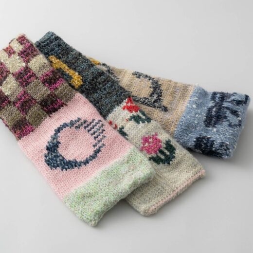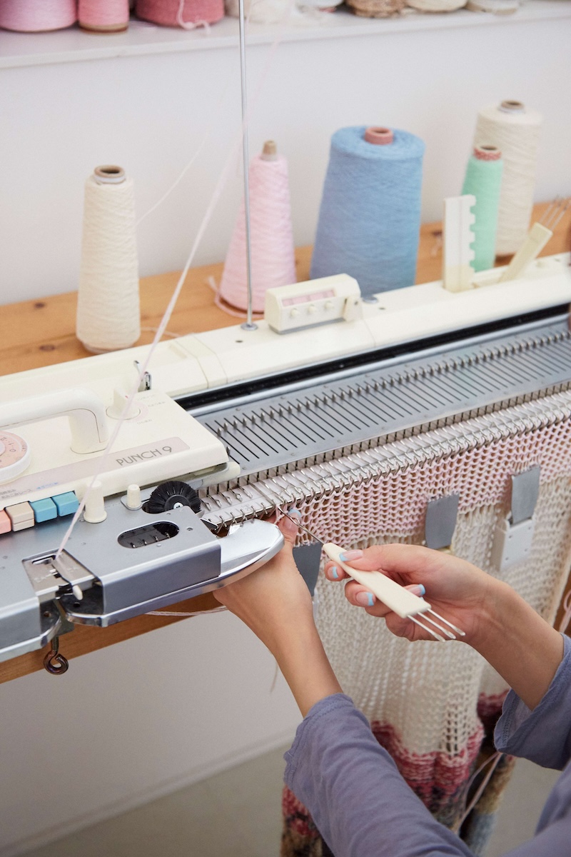 「家庭用編み機は、なくてはならない作品作りの相棒です。私が愛用しているブラザーのパンチナインなど多くは今の日本では製造されていないので、とても希少です。壊れてしまうと修理できる人も少ないので、壊れないでと話しかけながら大切に使っています。家庭用編み機の良さは、手編みだと限界がある量でも作れるし、余剰糸を使った柄編みや色替えがしやすいのも魅力です。あと、ブラザーやシルバーなど、かつては多くの家庭用編み機が日本で製造されていました。日本独特のものづくりの精神が詰まった家庭用編み機を使って制作していると思うと感慨深いですし、私のものづくりのポリシーとも通じる部分があって、とても大切な存在です」