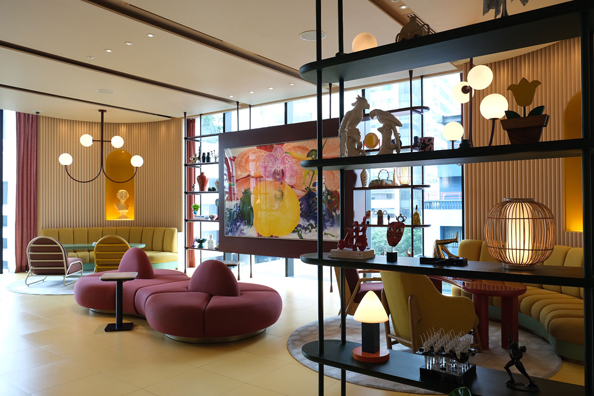 空間デザインは、スペインの鬼才ハイメ・アジョン氏によるもの。レトロフューチャーな曲線が多く取り入れられており、大胆な色彩で満たされたデザインが印象的だ。ホテルオーナーのアイテムなどもディスプレイされており、ロビー階にはジョアン・ミロの作品が鎮座するなど、館内各所にアートピースが散りばめられている。