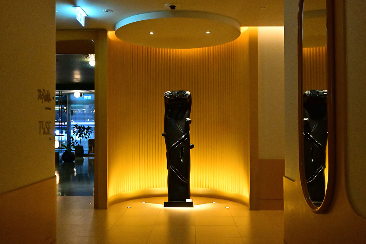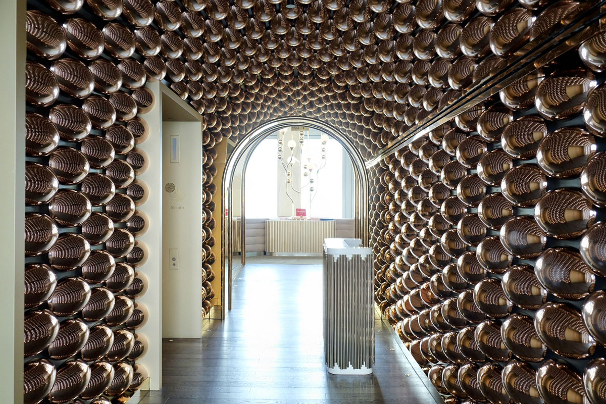 エレベーターの扉が開いた瞬間、息をのんだ。目の前に広がるのは、金と宝石の色調で彩られた、レトログラムで官能的な空間。古代ラテンアメリカ文明の神秘主義と、貴金属のきらめきにインスパイアされたというそのモダンでグラマラスな空間は、窓の外に広がるバンコクのパノラマと相まって、現実感を失わせるほどの力強さを持つ。