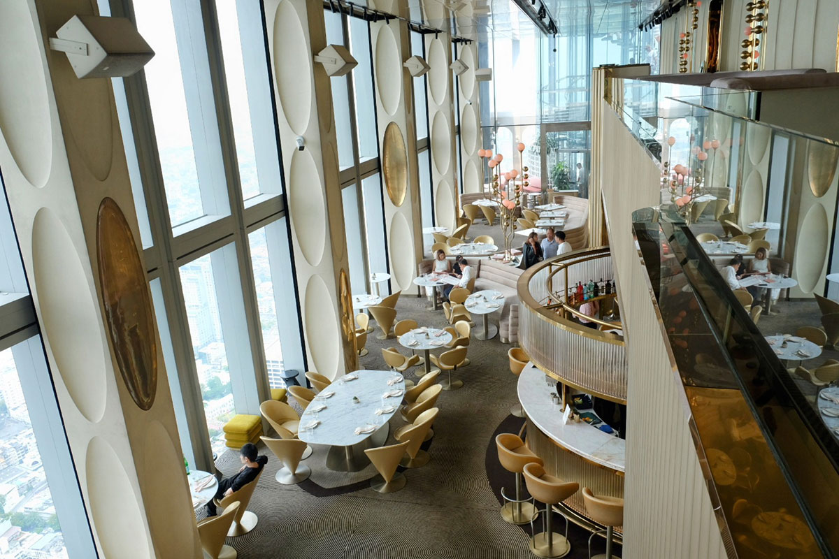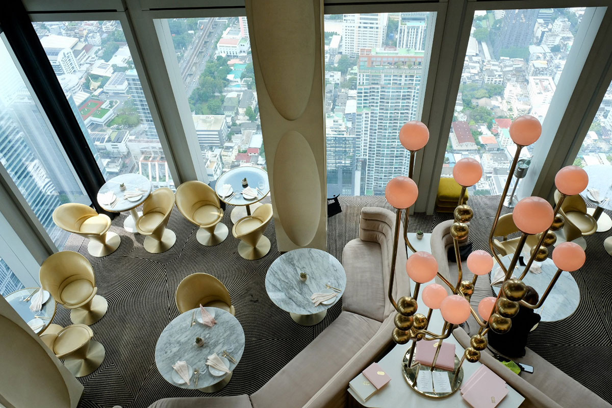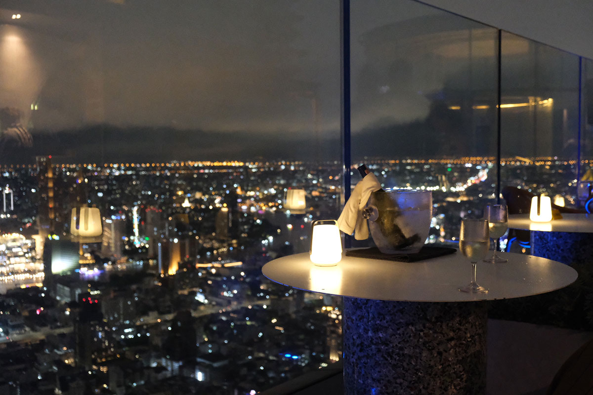 このホテルを訪れる最大の理由の一つが、76階に位置する「Ojo Bangkok(オホ・バンコク)」だ。スペイン語で「目」を意味する名の通り、地上300メートルからバンコクの街を見渡す、まさに天空のレストランとなっている。