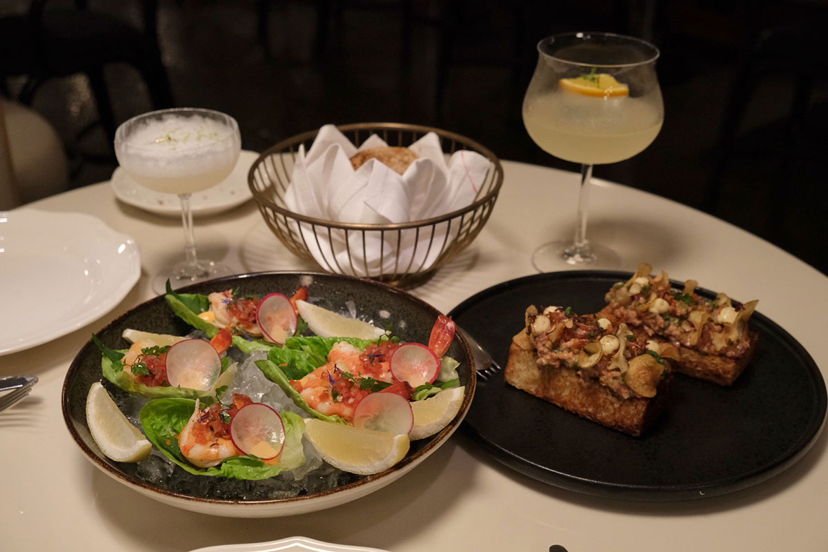 料理は薪火を使ったスモーキーな料理が目白押しだ。シュリンプカクテルは、チポトレや大葉、レタスがアクセントになっていて、アジアン風味。カリカリのチップスを合わせたビーフタルタルや、香ばしい自家製パンなど、前菜から薪火のダイナミックな調理法を感じさせる。