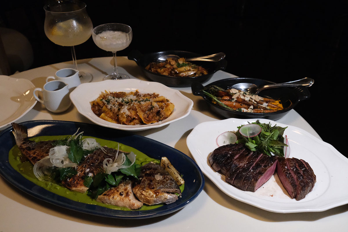 メインは270日間、穀物飼育されたブラックアンガス牛のステーキ。ビーフマーブルスコア5(日本のA5ランクのような立ち位置)という最高ランクのサーロインは、薪火で余分な脂が落ち、適度なサシが入ったやわらかく旨味の強い味わいだ。このほかにもフェンネルやアスパラガスのソース、イクラが添えられた鯛のグリルや、レモングレモラータというソースを合わせたラム肉のパスタといったシーズナルメニューなど、ひとひねり利いた料理が食欲をそそる。