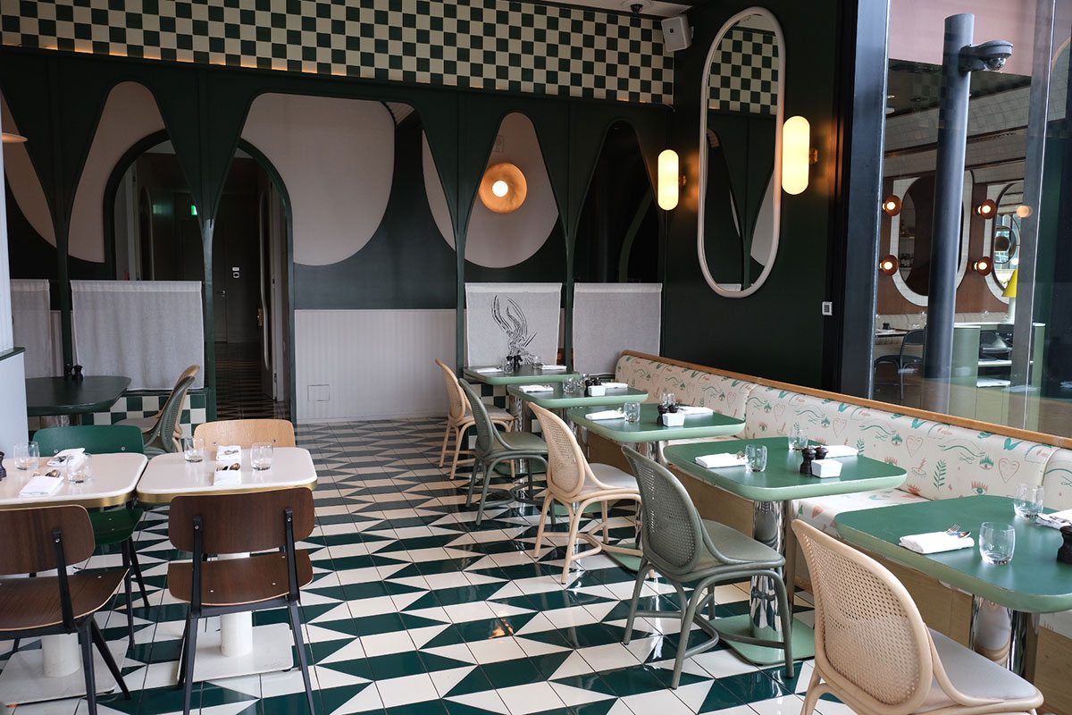 アーチ型の天井、真鍮のディテール、レザーのブース席、1セントコインが敷き詰められたアンティーク調のフロアなど、映画の登場人物になったかのような内装にも浮足立つ。