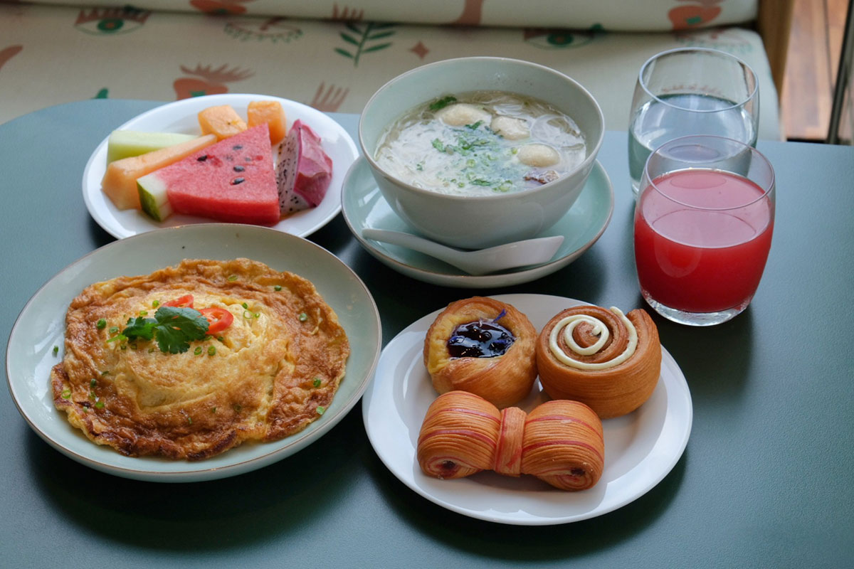 朝食はハーフブッフェスタイルで、メインディッシュはソムタムなどの冷菜や、タイヌードルやタイ風オムレツなどタイ料理の温菜、エッグベネディクトやクロックマダムなどの西洋料理から好きなだけチョイスが可能。ブッフェ台には色とりどりのフルーツやサラダ、焼きたてのパンが並ぶ。テラス席は愛犬同伴もOK(ホテル自体がドッグフレンドリー)とあり、愛らしいワンちゃんたちの姿を目にすることもできる。